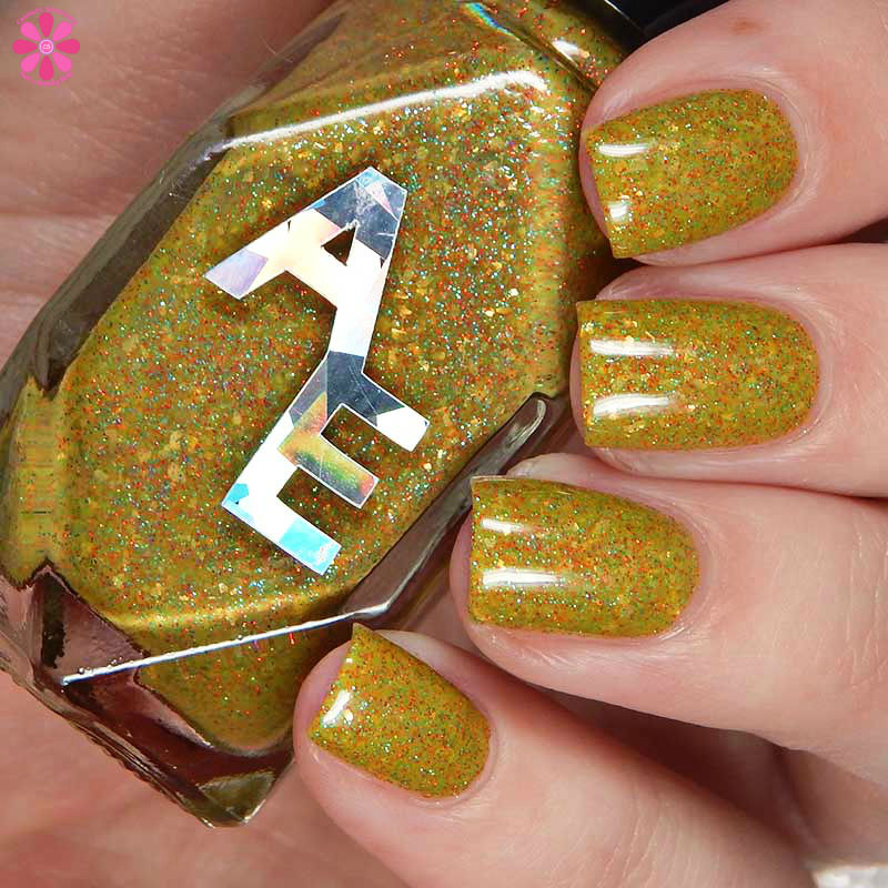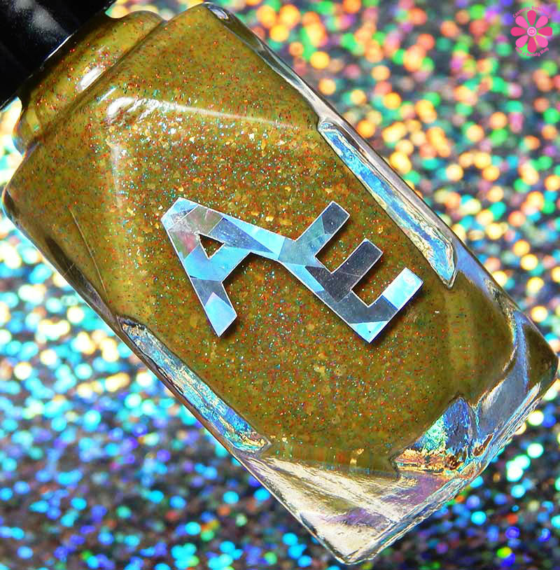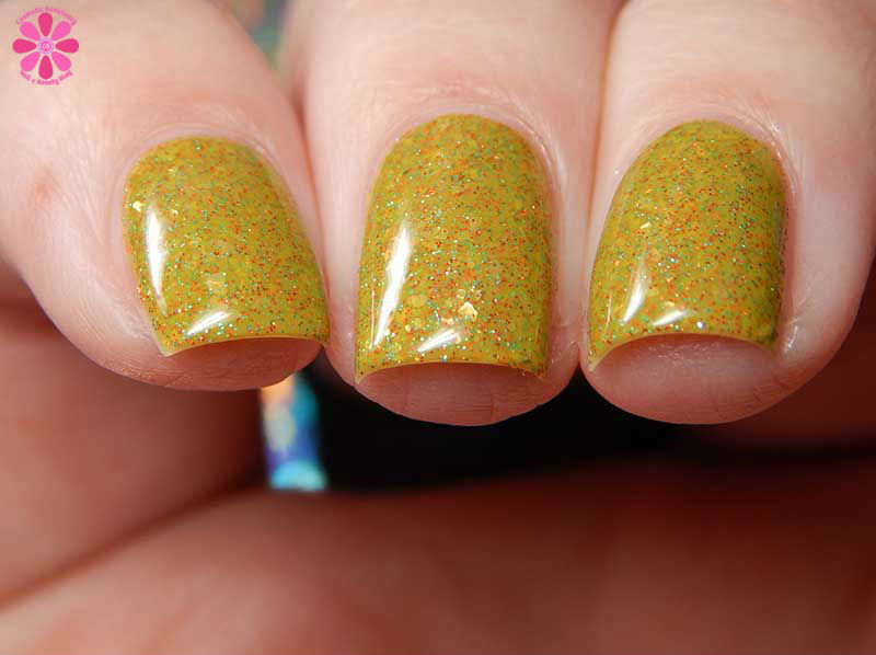 Alter Ego Nail Enamel Greta Gremlin is a mustard yellowish green crelly base packed with gold, green and red microglitters. It’s a very interesting combo but somehow it just works together. I used 3 thin coats and a glossy top coat for these photos.
