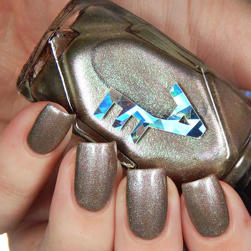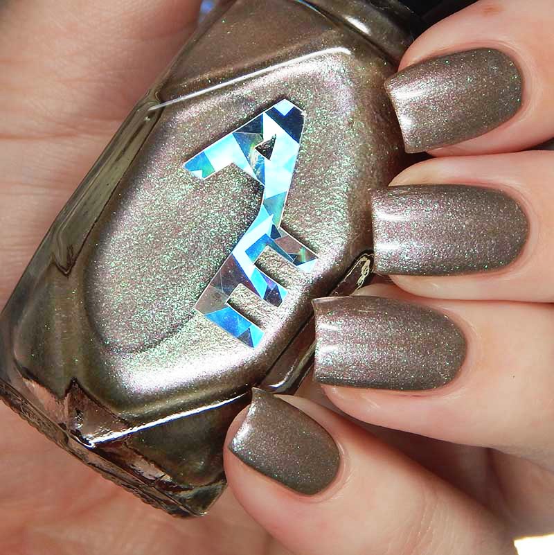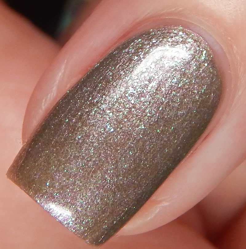 Alter Ego Nail Enamel is a slightly taupish grey that has shimmer that shifts a pinky lavender and has blue to green shifting microglitters mixed in. I used 3 thin coats and a glossy top coat for these photos.
