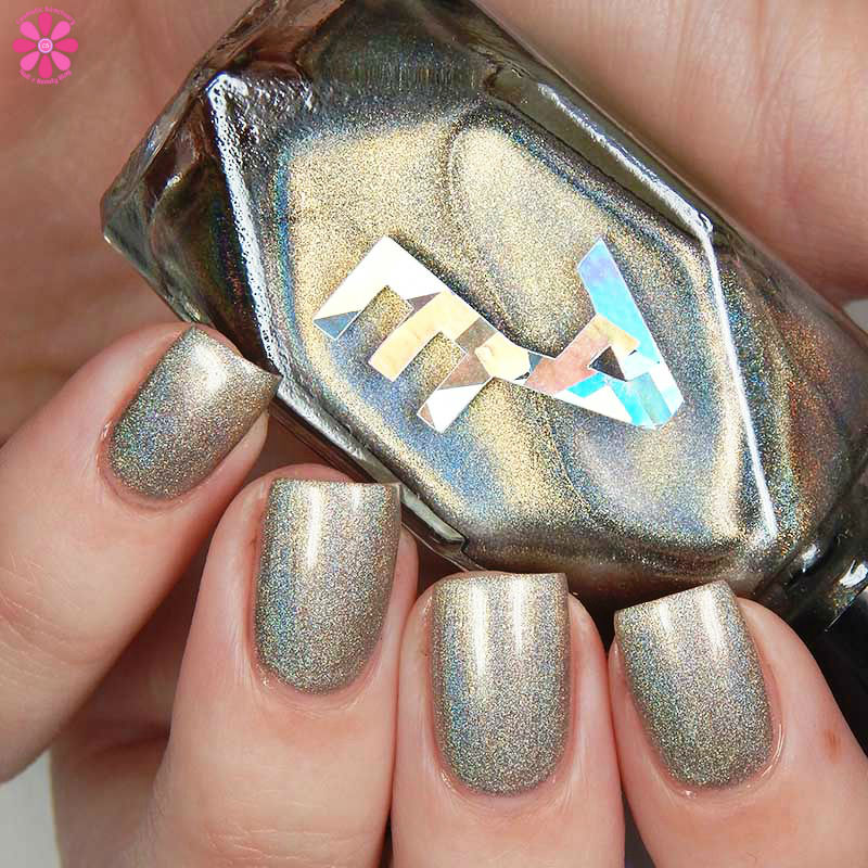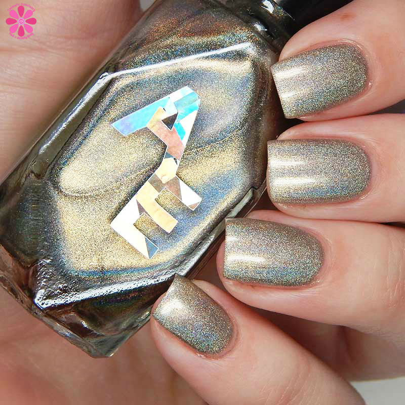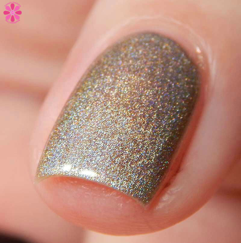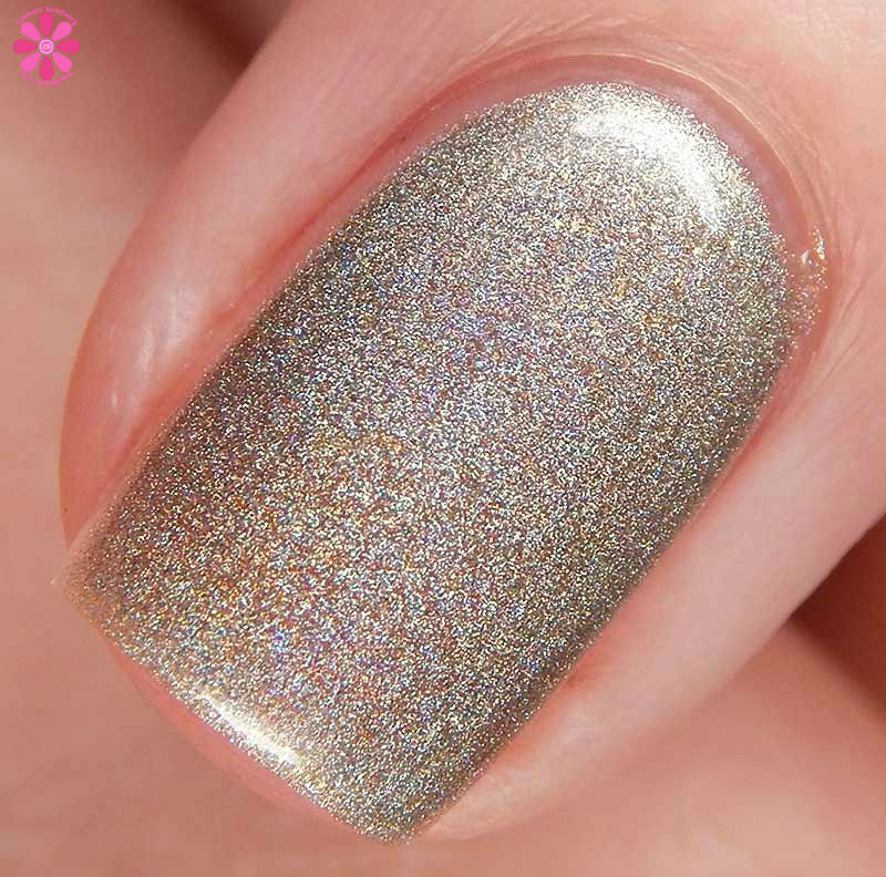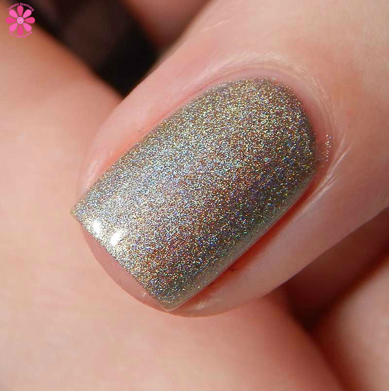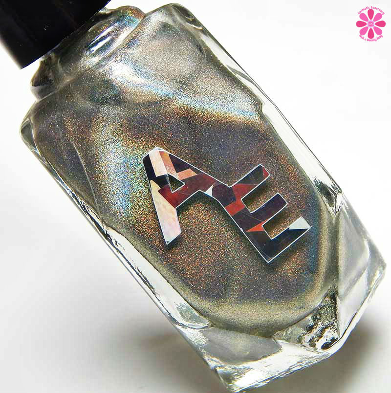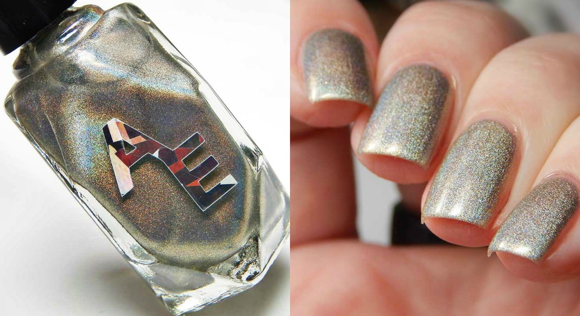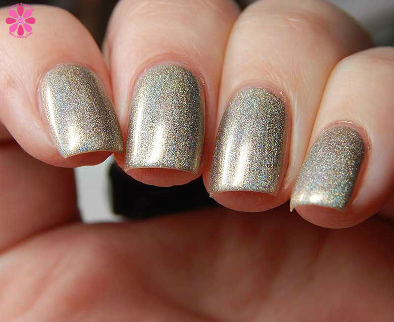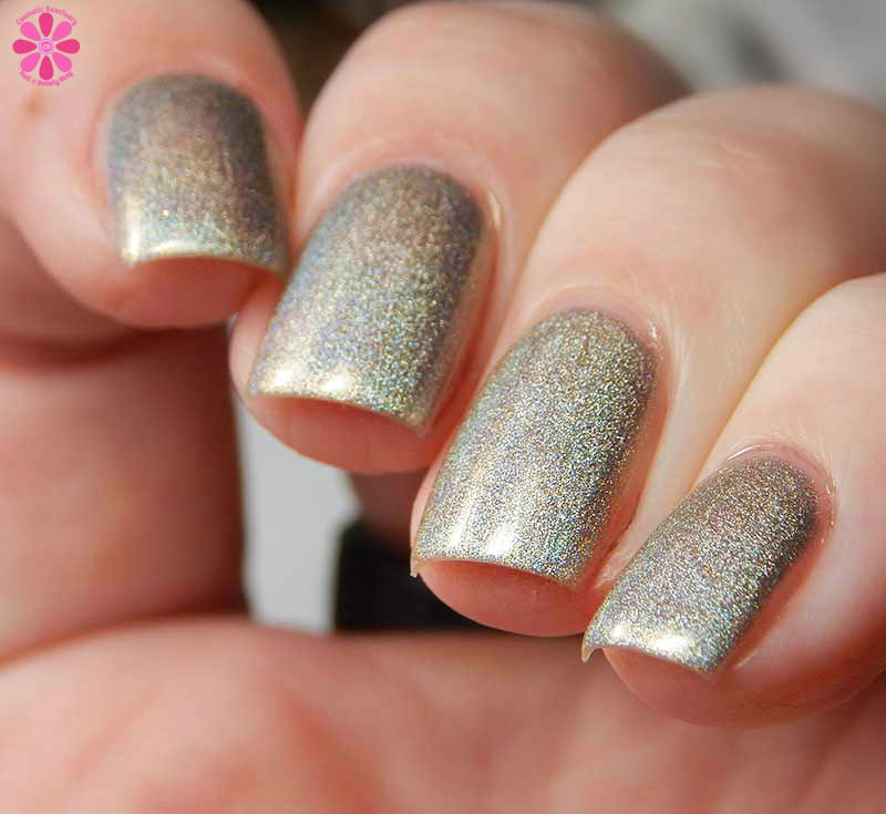 Alter Ego Nail Enamel Silver Cocktail is a silver linear holographic with strong gold shimmer mixed in. I used 2 easy coats and a glossy top coat for these photos.