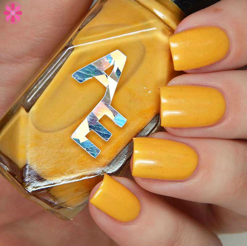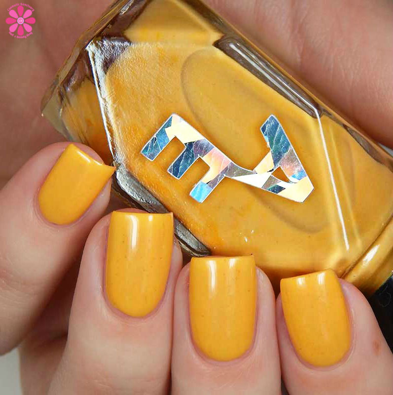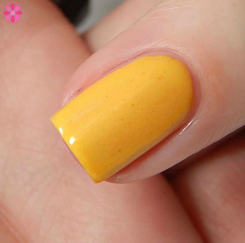 Crème de Banane is a slightly dusty yellow creme with light brownish speckles in it (like a banana has!) I used 3 thin coats and a glossy top coat for these photos.