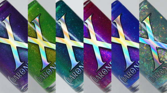 The Baroness X The Sage Collection is a 6 piece collection of jelly based polishes with shimmers and flakes. Well, 6 are jelly based and one is a topper. There will also be a pen available that has the same flakes in it as the topper.