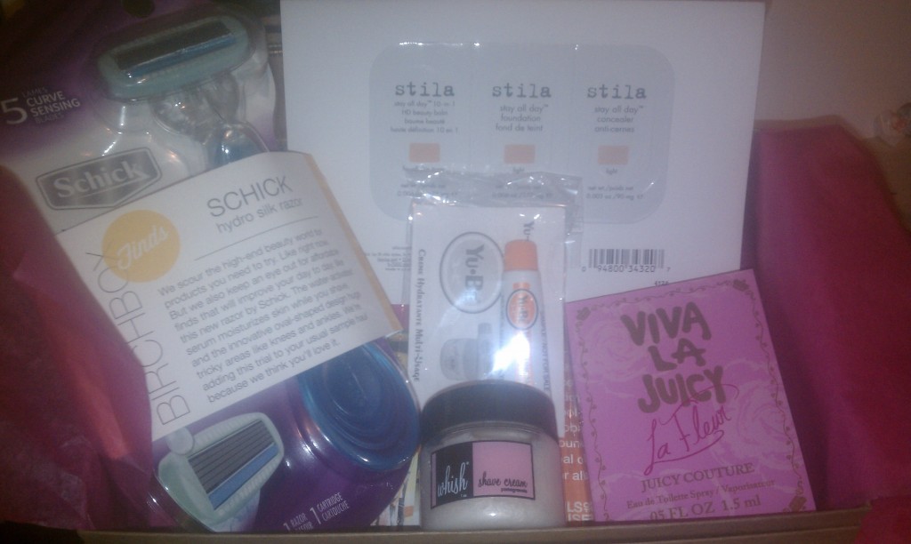My August Birchbox was just ok.  Honestly if the Schick Hydro Silk Razor wasn’t in there, I would have been disappointed.  There was also a deluxe sample of Whish Shave Cream in Pomegranate, Viva La Juicy La Fleur perfume sample , Yu-Be Moisturizing skin cream and Stila Stay All Day Foundation samples.