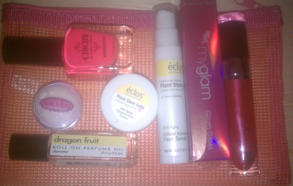 My August MyGlam bag was pretty good.  I received a full size Circus Nail Polish, Salty Cosmetics Mineral eyeshadow, Eclos eye cream and face serum, Demeter roll on Perfume and a MyGlam Glam Gloss (and of course the pink mesh like cosmetic bag under the products in the photo).