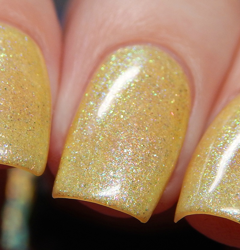 Apple Jack is a semi sheer, pale yellow base with iridescent shimmer flecks. I used 3 coats and a glossy top coat for these photos.
