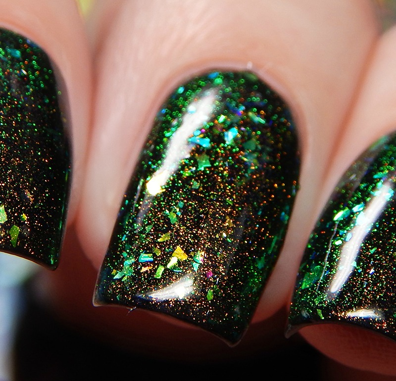 Fairy Dust is the third and final exclusive! This is a clear base packed with a unicorn pee “sister” pigment that shifts gold to green, as well as iridescent flakes that shift from pink to gold to green. I used 1 coat over a black creme and a glossy top coat for these photos.
