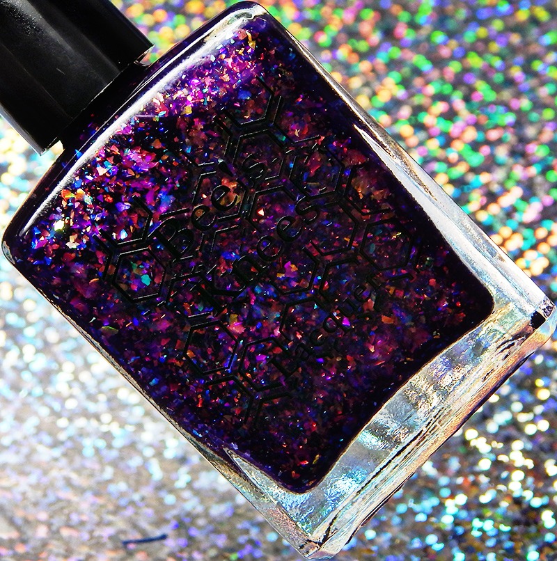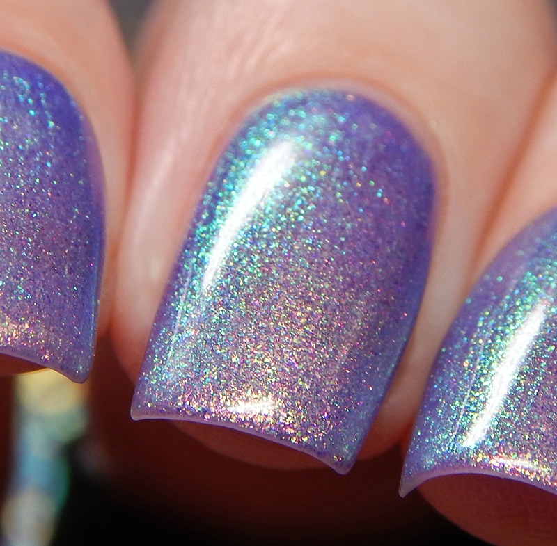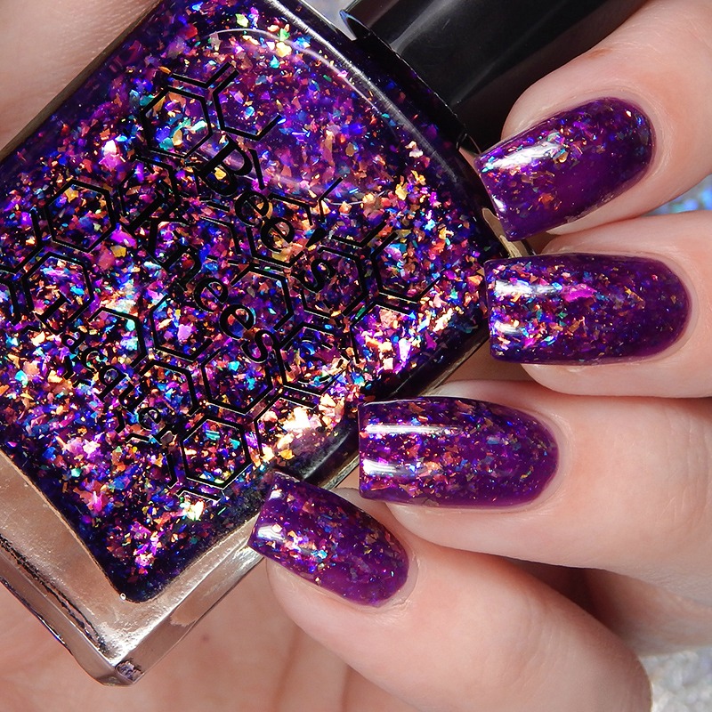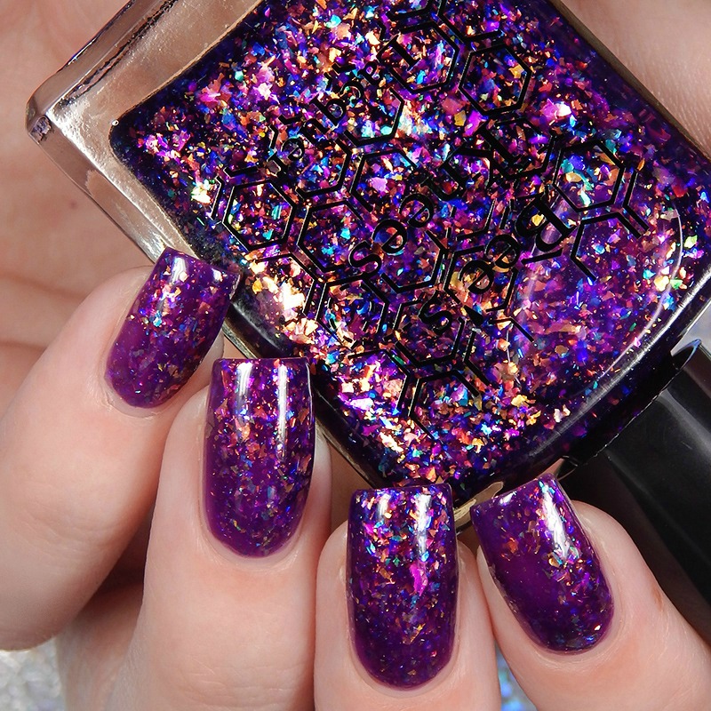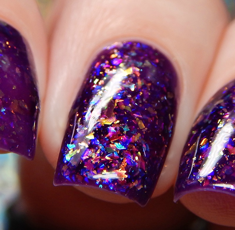 Kraken Wise is a vibrant grape jelly base PACKED with iridescent flakes that shift aqua to orange to red to pink to purple to blue. I used 3 thin coats and a glossy top coat for these photos.