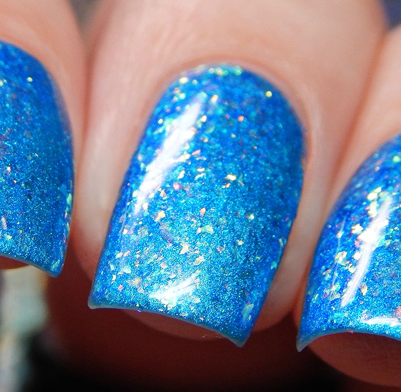 Siren Song is a metallic looking cobalt blue base with blue to purple shifting shimmer, as well as iridescent flakes that flash various colors of the rainbow.  Because of my lighting, and the reflection of the base color, some of the flakes appear to be “swallowed” up, but they are more apparent in person.