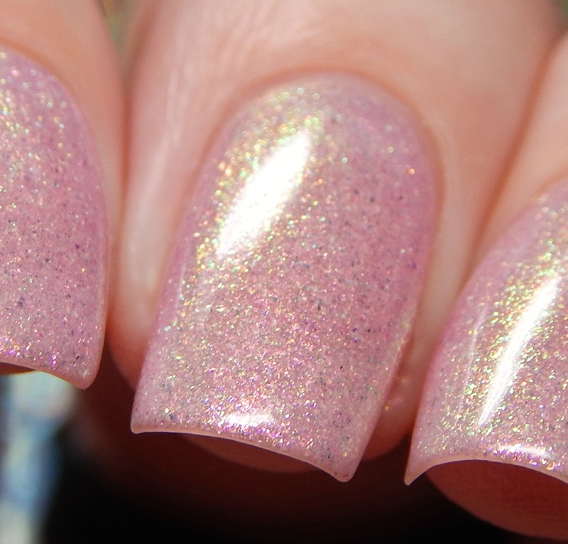 Pinkie Pie is a semi sheer cool toned pink base with pink to gold iridescent shimmer flecks. I used 3 thin coats and a glossy top coat for these photos.