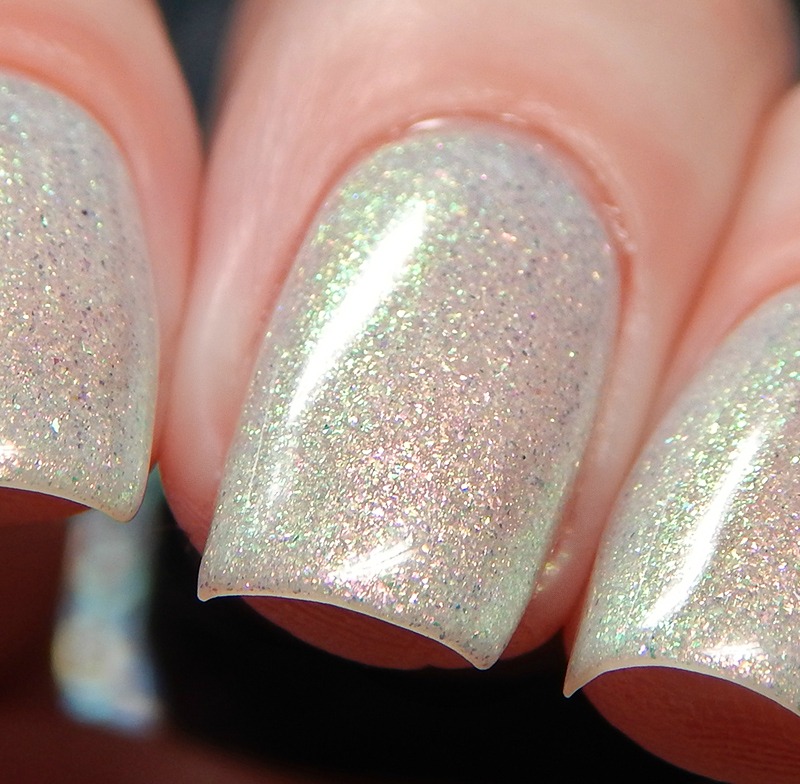 Rarity is a semi sheer white base with pink to gold shifting iridescent shimmer flecks. I used 3 coats and a glossy top coat for these photos.