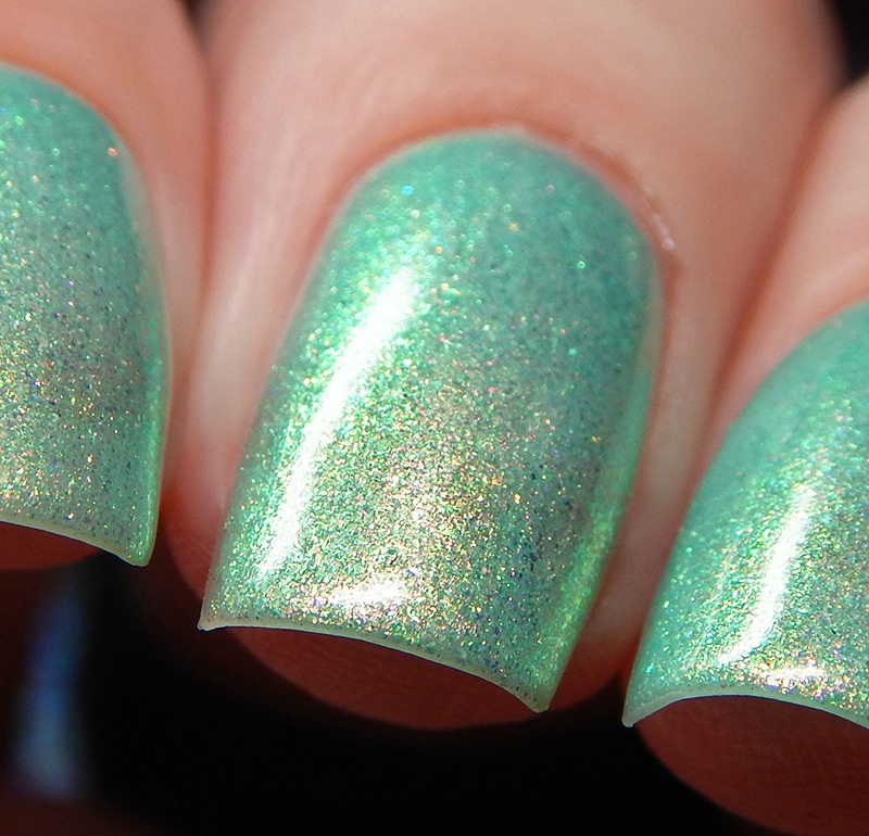 Spike is a semi sheer, pale minty green base with gold to green shifting iridescent shimmer flecks. I used 3 thin coats and a glossy top coat for these photos.