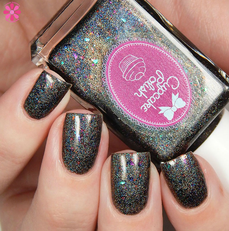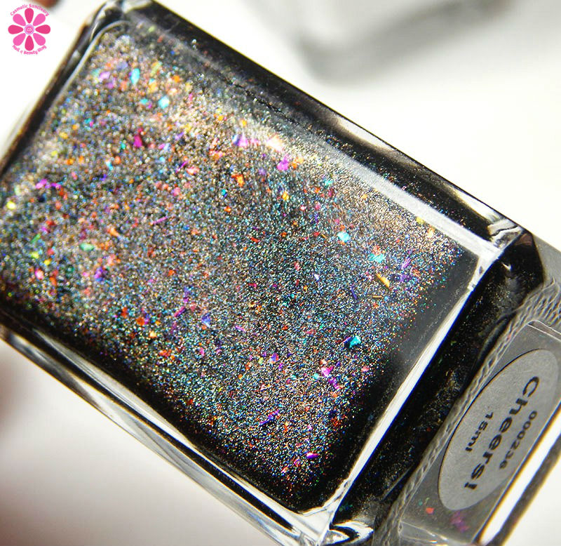 Cupcake Polish created Cheers! Cheers! is a black linear holographic with green to yellow, red to blue to magenta, and teal to purple to magenta multichrome flakes. There is a lot going on in this polish and when I took the macro, it flipped my camera out and wouldn’t completely focus. I didn’t include it in the post because it honestly hurt my eyes to look at the blurriness.