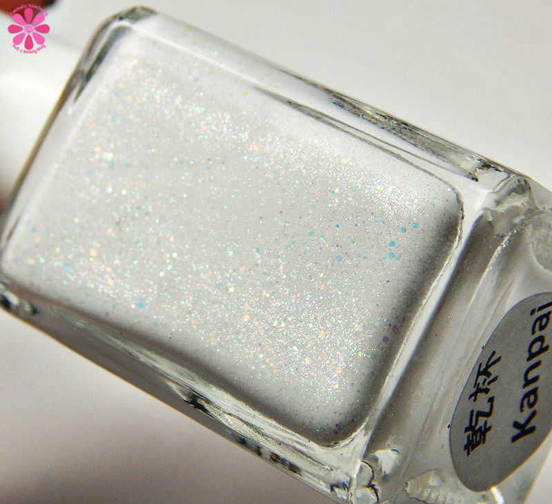 Blue Eyed Girl Lacquer created Kanpai! Kanpai is a white crelly base packed with silver and red shimmer, lime to gold to green iridescent glitter, red to gold to green shifting glitter, purple to green shifting shimmer, and clear holographic glitter. I used 3 thin coats and a glossy top coat for these photos.
