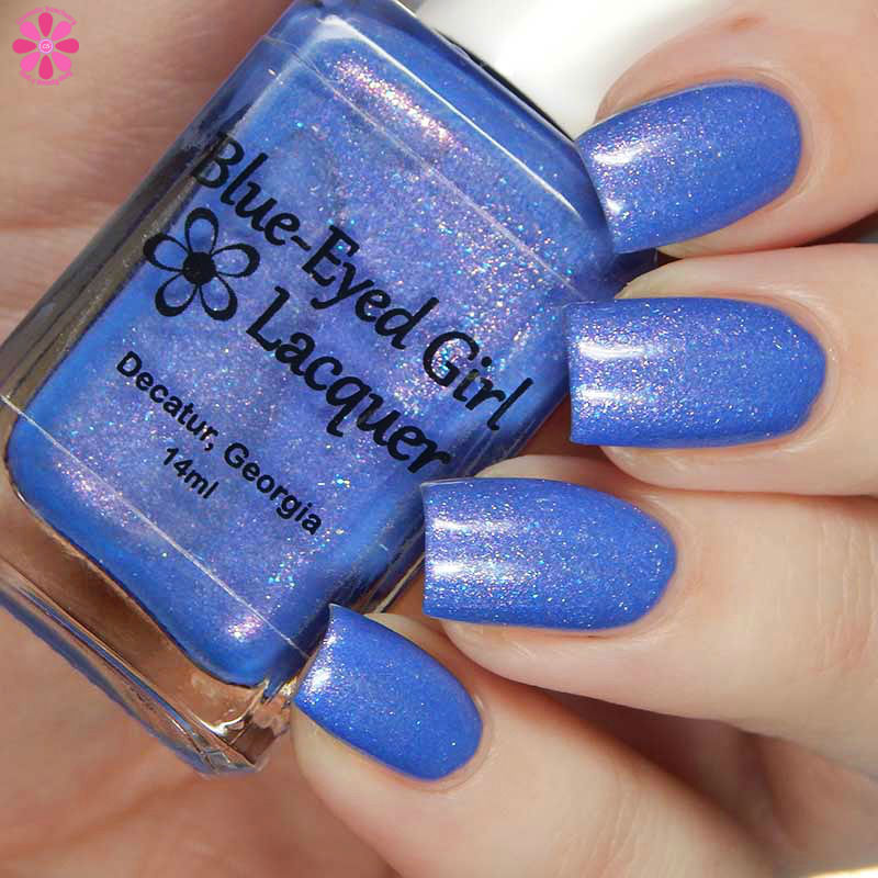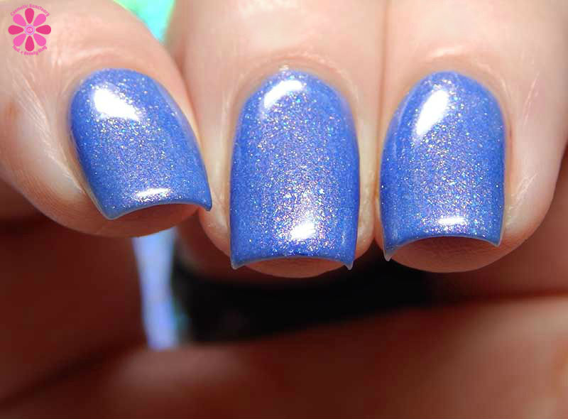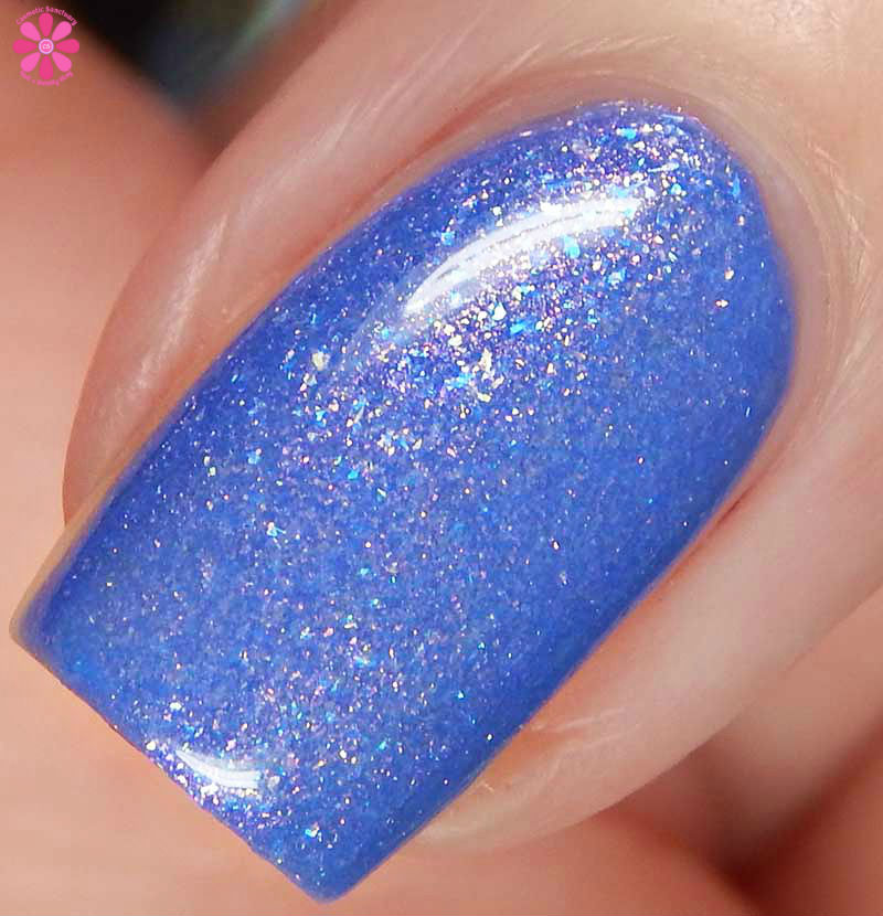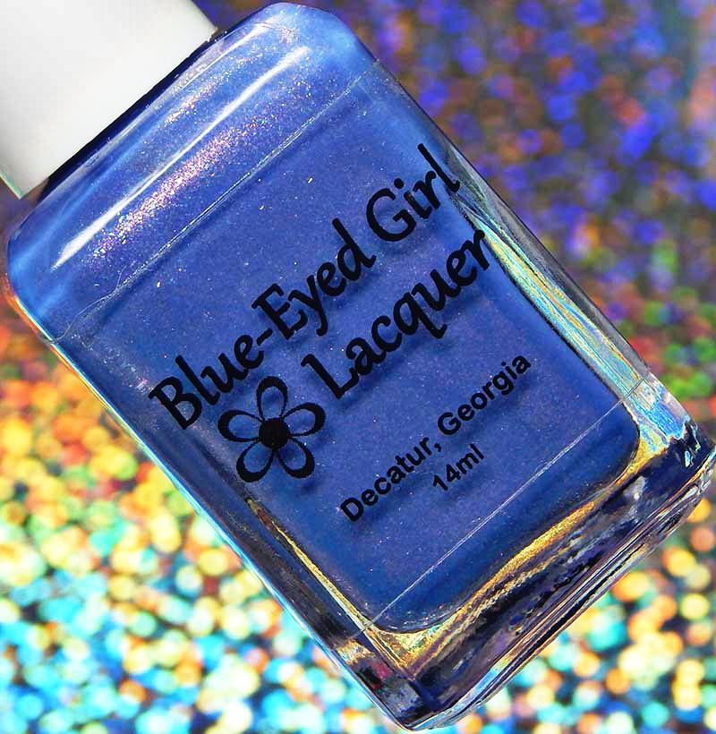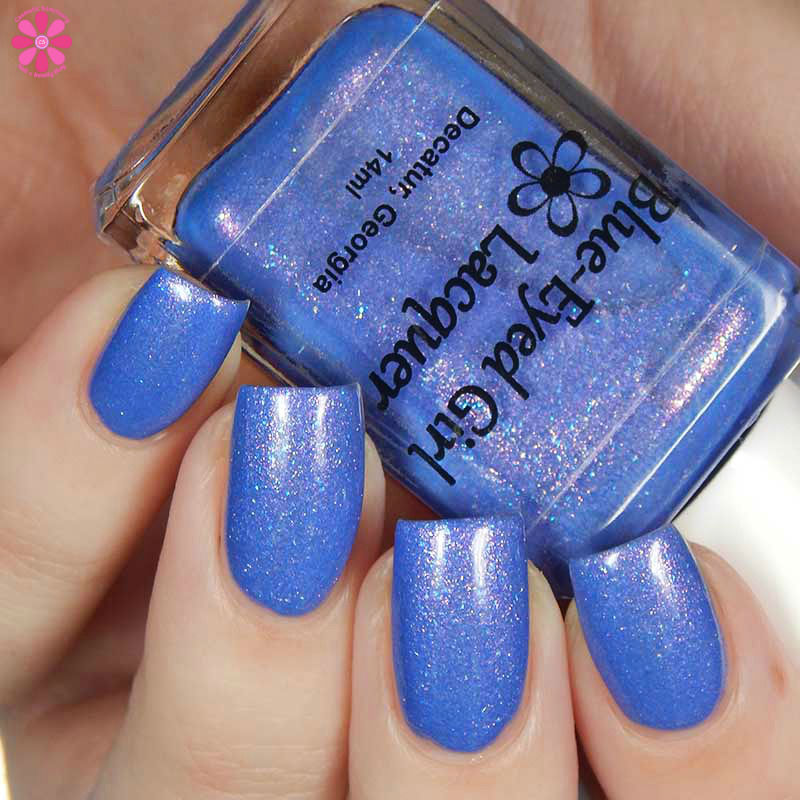 Blue Eyed Girl Lacquer Handsomest Boy is a purple-leaning periwinkle crelly based shimmer with ultra-fine red to pink shimmer, gold, and blue shimmers as well as blue and gold microflakies. I used 3 thin coats and a glossy top coat for these photos.