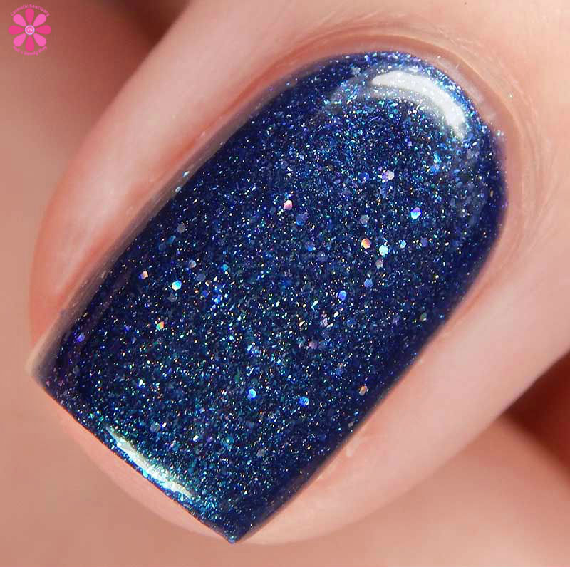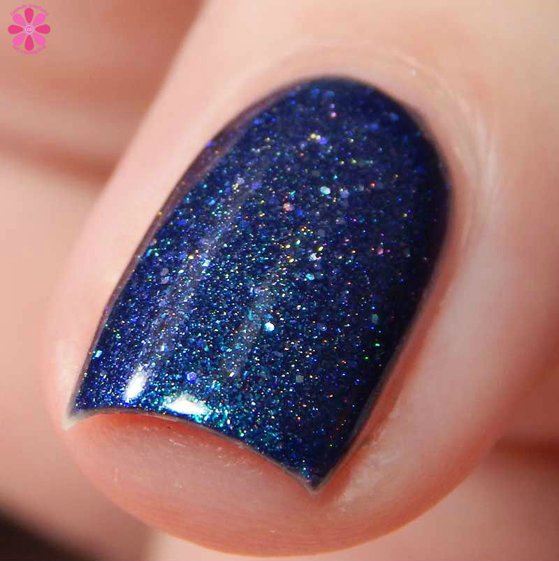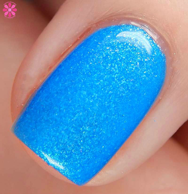 On B-Days We Wear Blue is a bright blue creme base with green to purple duochrome shifting microflakes. I used 2 coats and a glossy top coat for these photos.