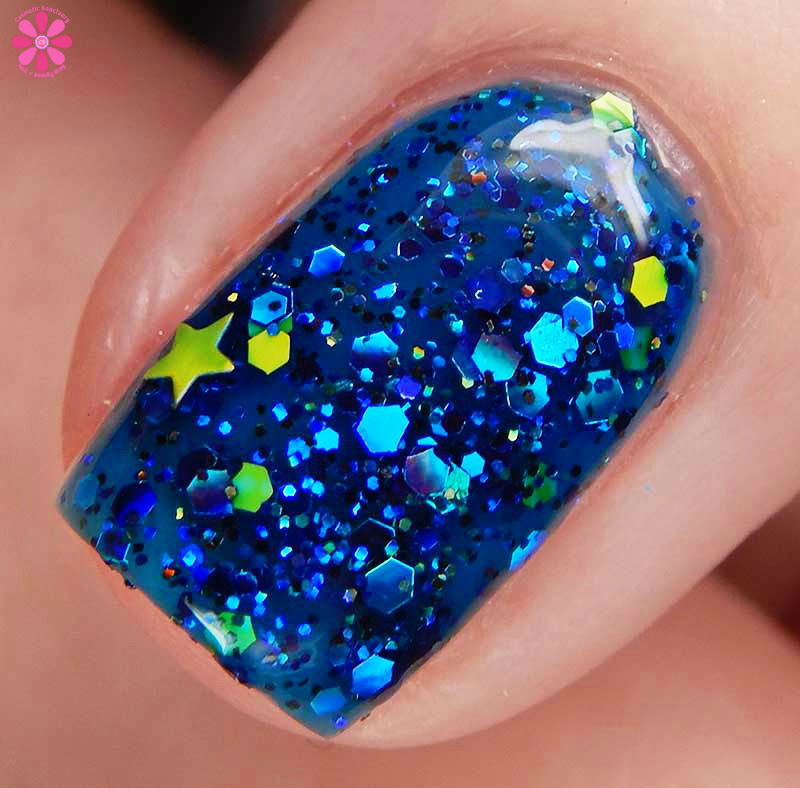 Morning Star is a navy blue jelly base packed with black holographic microglitters, blue holo glitters in various sizes, yellow matte glitters and matte yellow mini stars. I used 2 coats and a thick, glossy top coat for these photos.