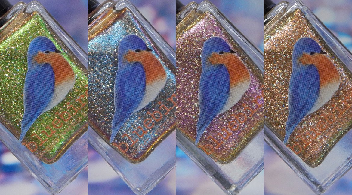 All 4 of these shifty Fall shimmers also have a ton of scattered “shattered” holo mixed in as well for that signature Bluebird Lacquer look.