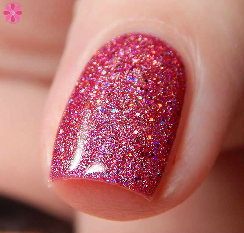 Hear Me Roar is a magenta jelly based linear holographic with pink holographic glitters in various sizes. I used 3 thin coats and a glossy top coat for these photos.