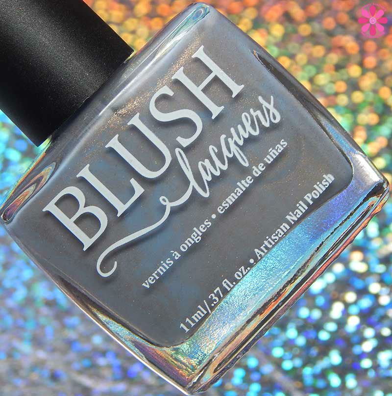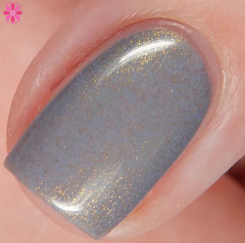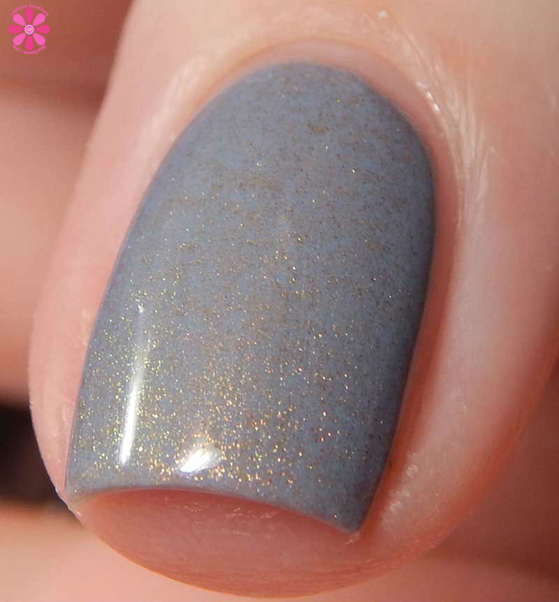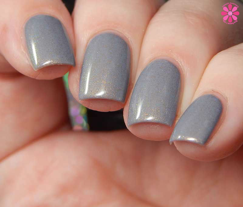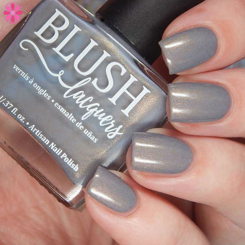 BLUSH Lacquers Lakeside Manor is a blue leaning medium grey creme with shimmer that shifts from gold to copper and you can see hints of green at extreme angles. I used 3 thin coats and a glossy top coat for these photos.