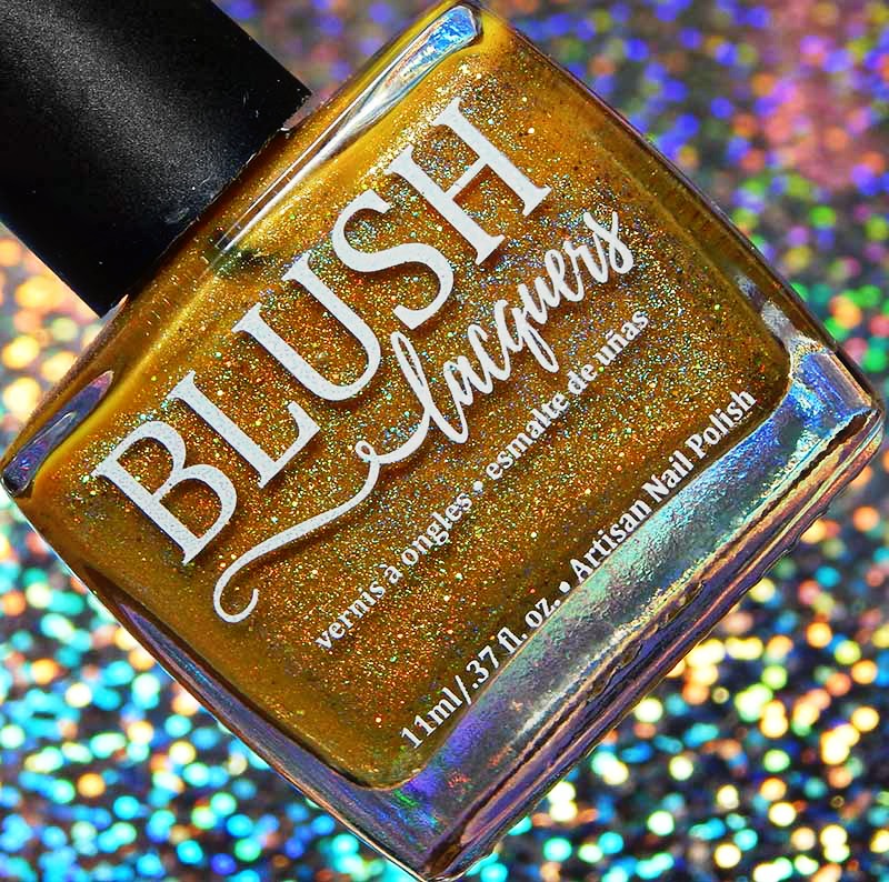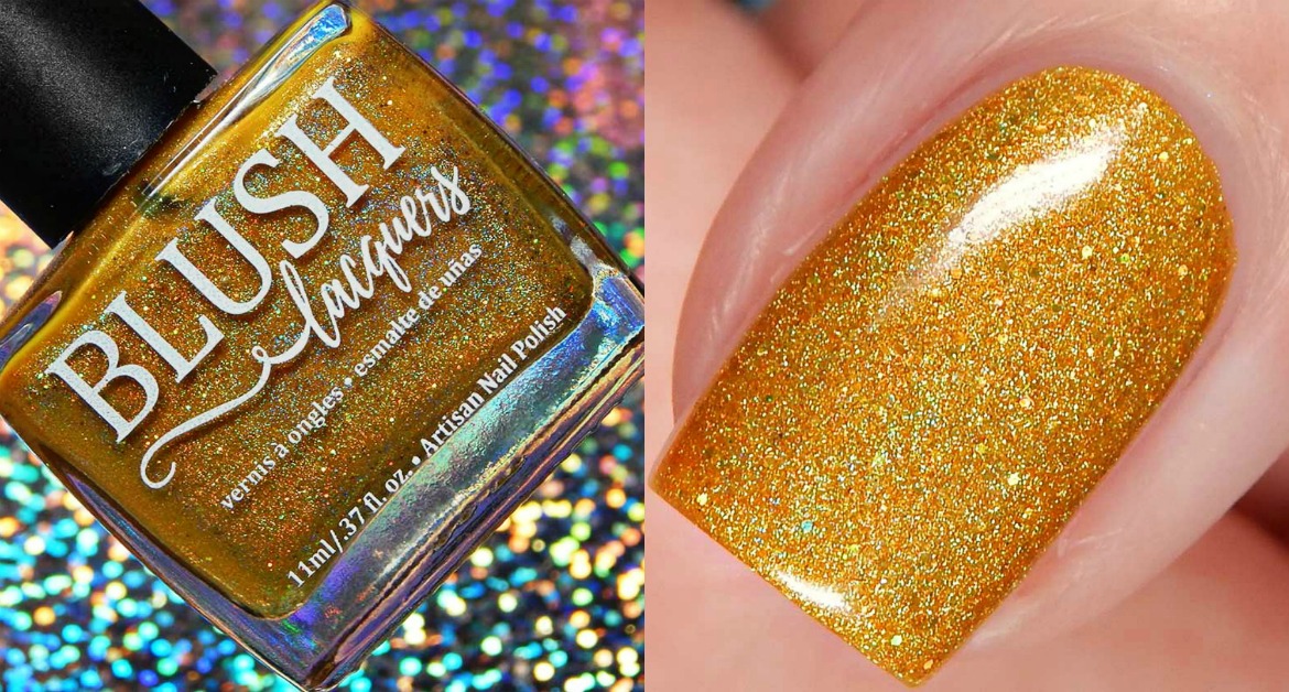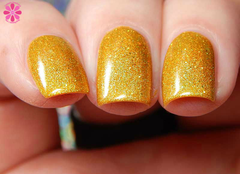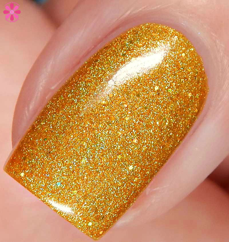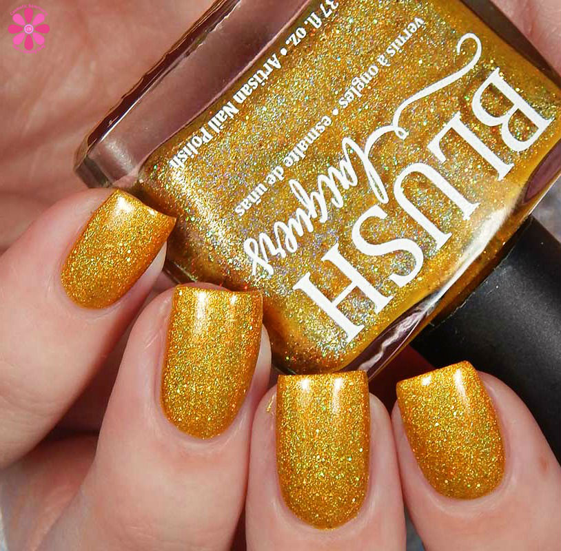 BLUSH Lacquers No Soldier Left Behind is a golden mustard yellow linear holographic with gold holographic microglitter and gold flakes add in. I used 2 coats and a glossy top coat for these photos.