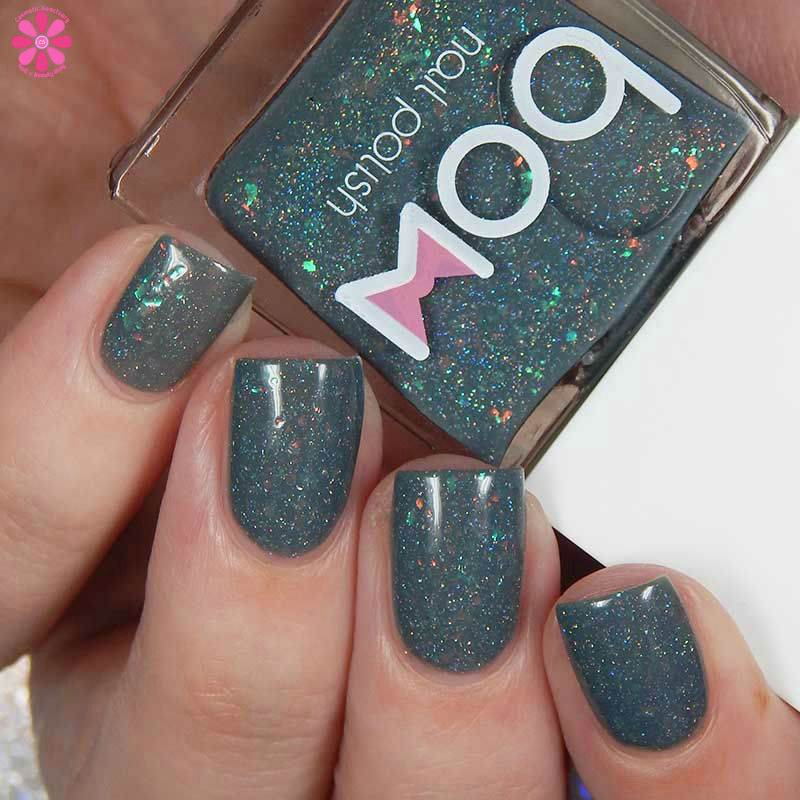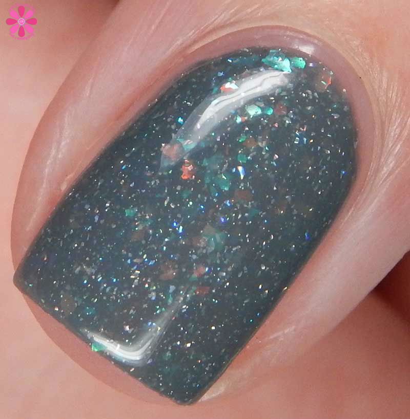 Ashes To Ashes is my top pick from the 5 I received. This is a medium blue tinged grey crelly base with silver holographic microflakes as well as rainbow iridescent flakes. I used 3 thin coats and a glossy top coat for these photos.