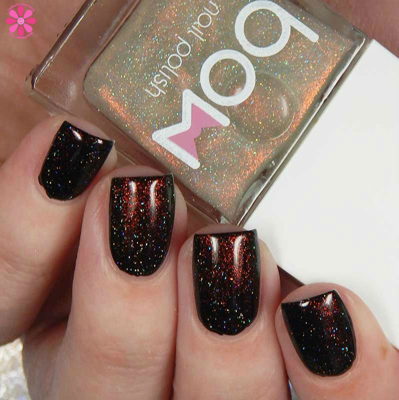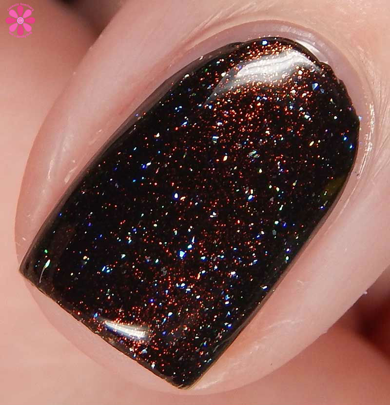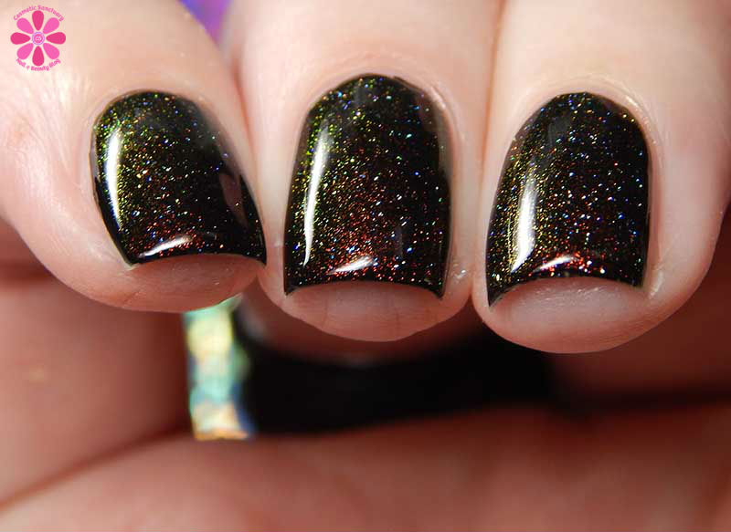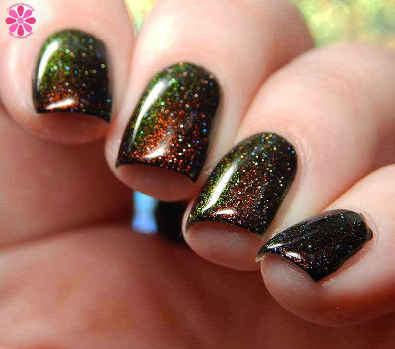 Avalanche is a clear base packed with red to orange to green to gold shifting shimmer and silver holographic microflakes. I used 1 coat of Avalanche over a black creme base.