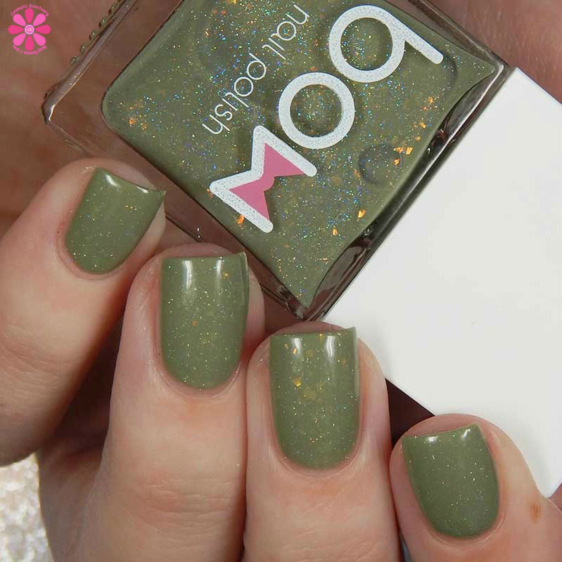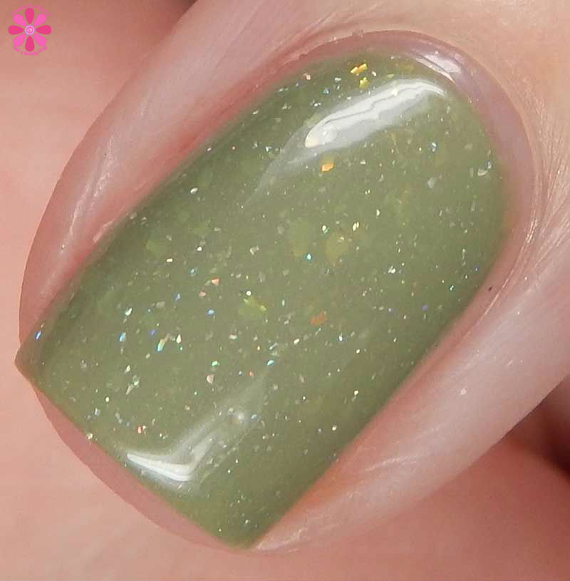 Delete, Repeat is similar to Ashes to Ashes, but the base is a medium dusty olive green. It contains a mix of red to orange to gold iridescent flakes and silver holographic microflakes. I used 3 thin coats and a glossy top coat for these photos.
