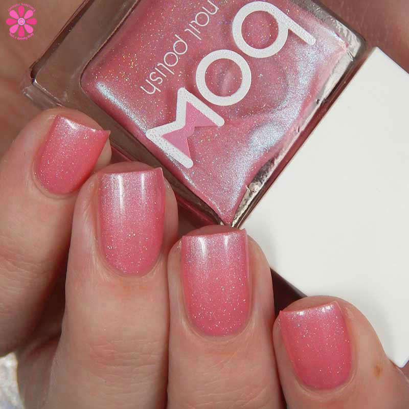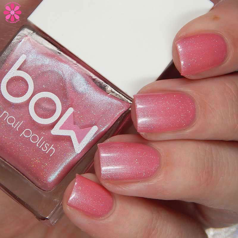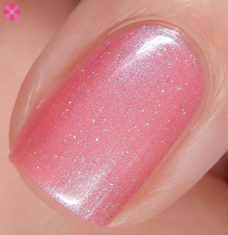 Flower Bomb is a soft candy pink with blue shimmer and a sprinkling of holographic microglitters. I used 2 coats and a glossy top coat for these photos.