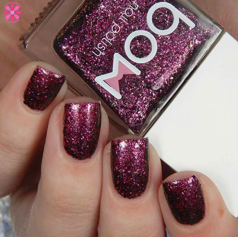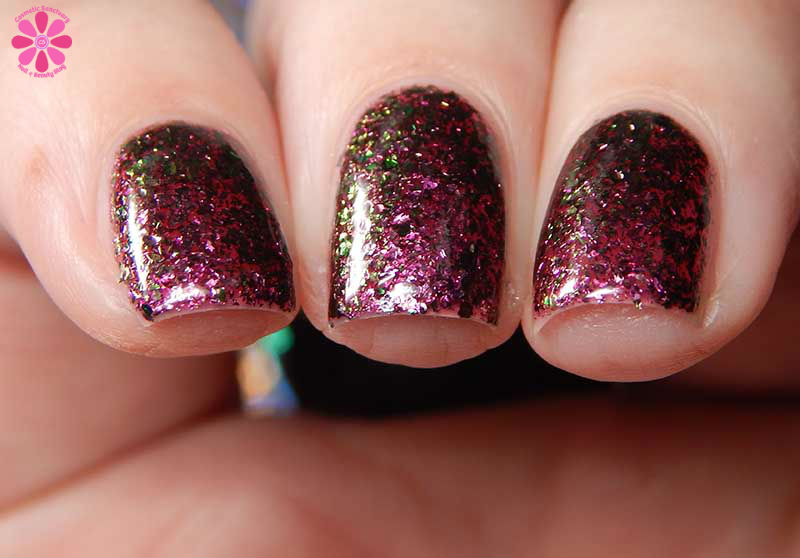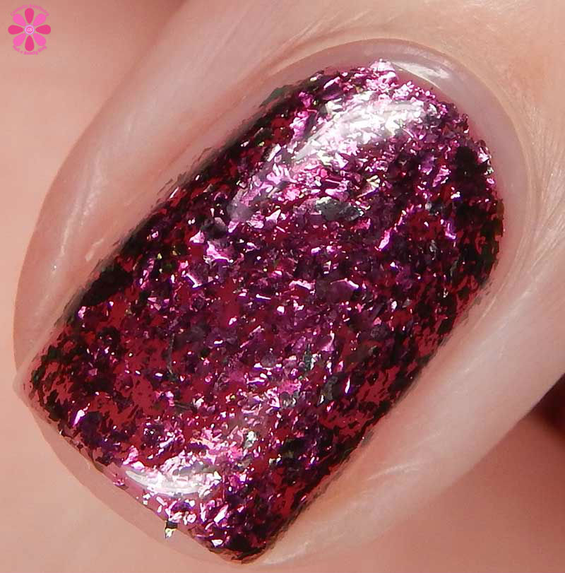 Playing With Fire is a sheer raspberry jelly base packed with magenta to green to gold metallic flakes. I used 3 thin coats and a glossy top coat for these photos.