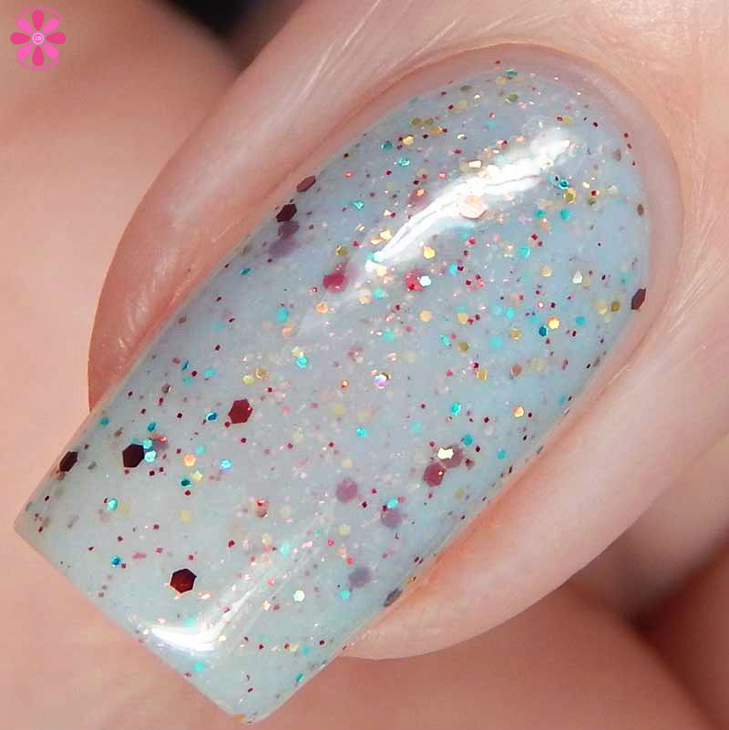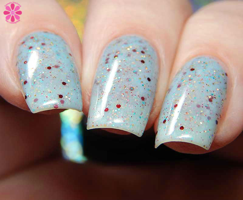 Elves is a light blue crelly base with red shimmer, two sizes of red metallic glitter, copper and gold holo glitter, and small ocean blue glitter. I used 3 thin coats and a glossy top coat for these photos.