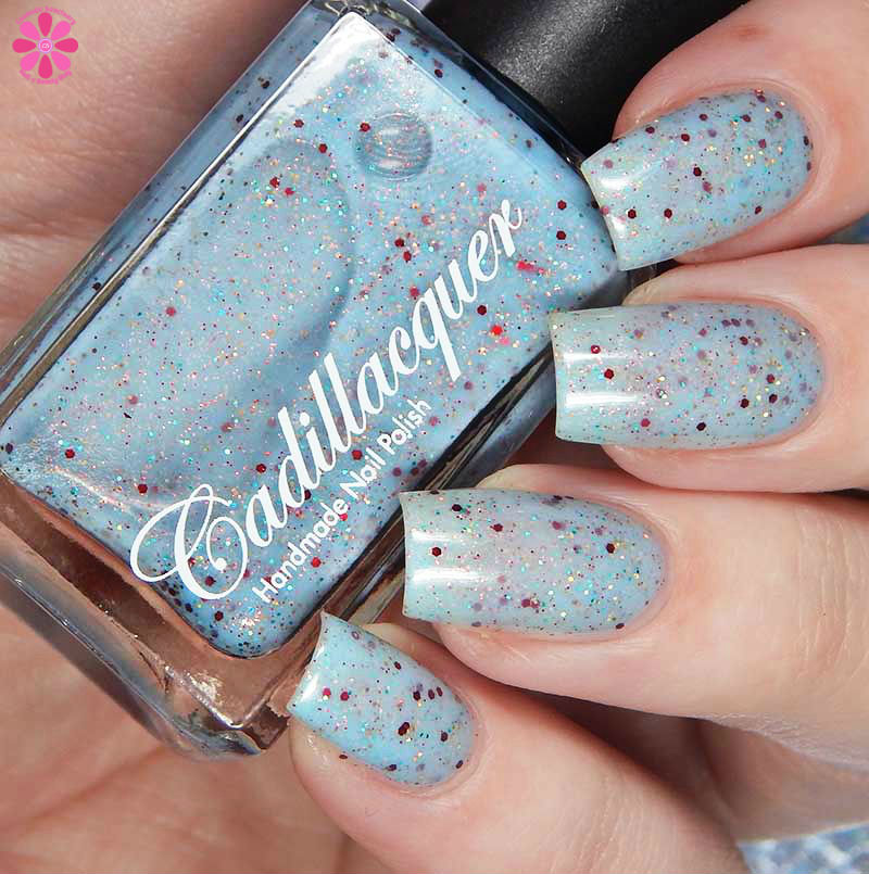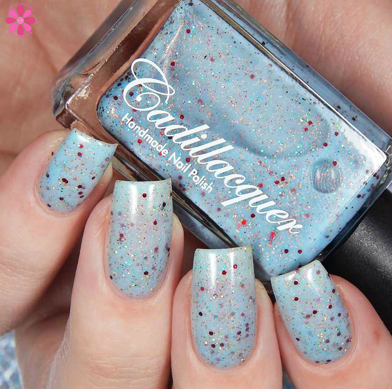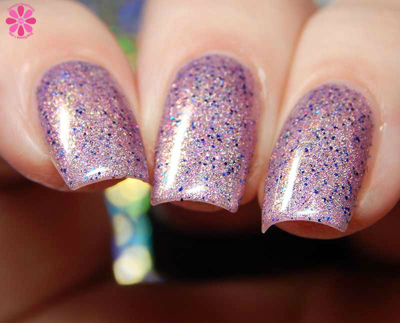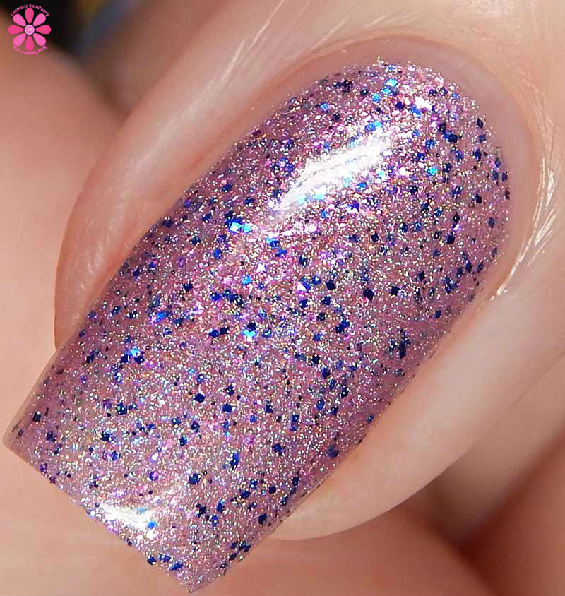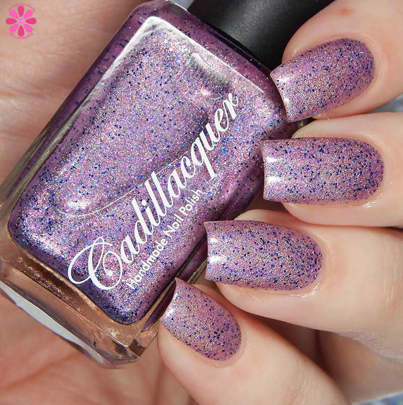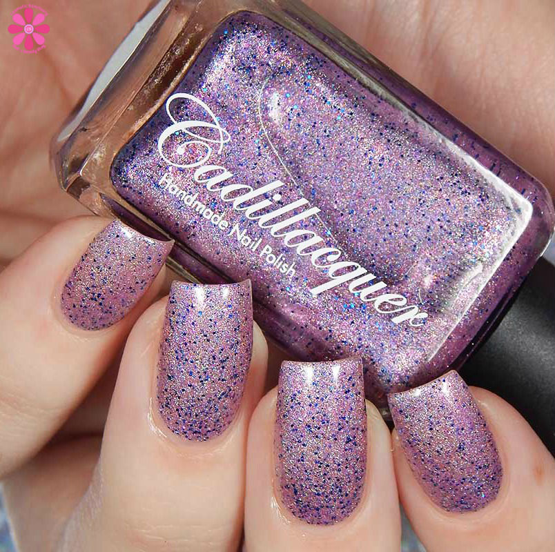 Cadillacquer Flickering Lights is a lilac pink scattered holo with pink shimmer and navy blue metallic glitter. I used 3 thin coats and a glossy top coat for these photos.