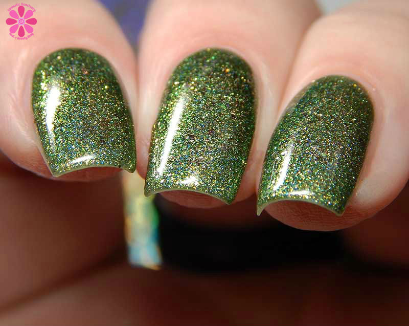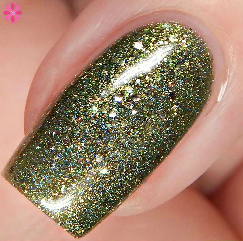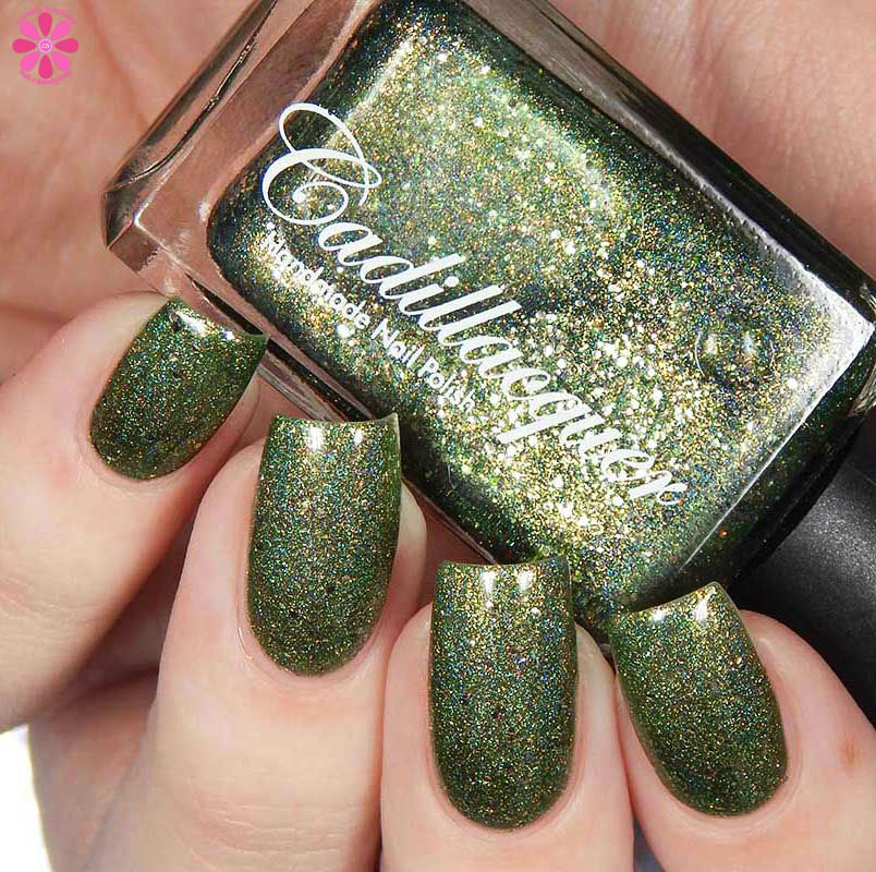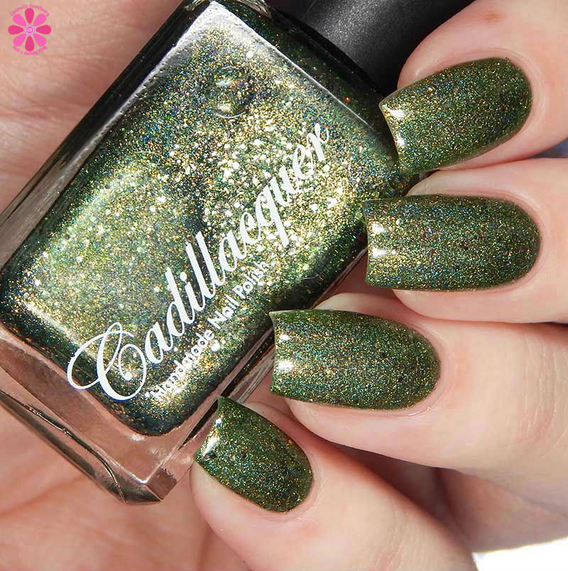 Cadillacquer Joy is a gorgeous medium green holo with gold shimmer and different sizes of light gold metallic glitter. I used 3 thin coats and a glossy top coat for these photos.