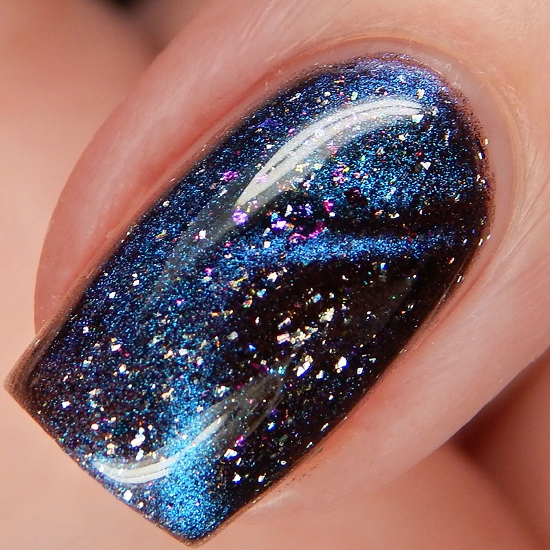 Cameo Colours Lacquers 2,191 Days Of Awesome is a blue to purple duochrome with pink to gold ultrachrome flakes and holo microflakes. When you use the magnet it pulls the purple to blue shift. I used 3 thin coats and a glossy top coat for these photos, but you can easily use just 2 coats.