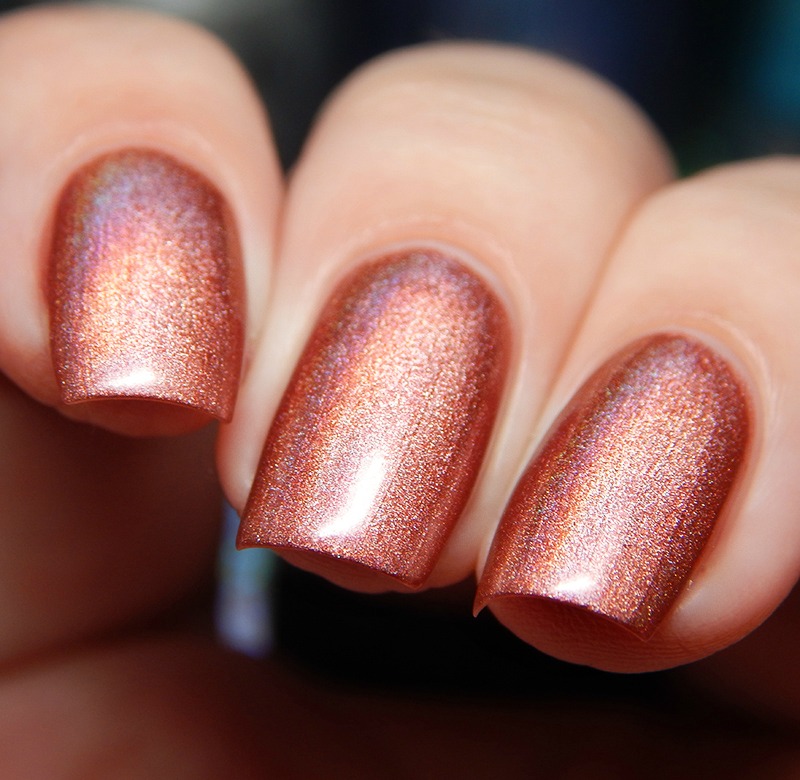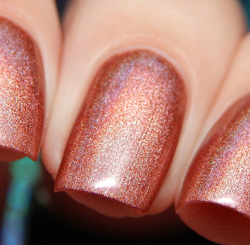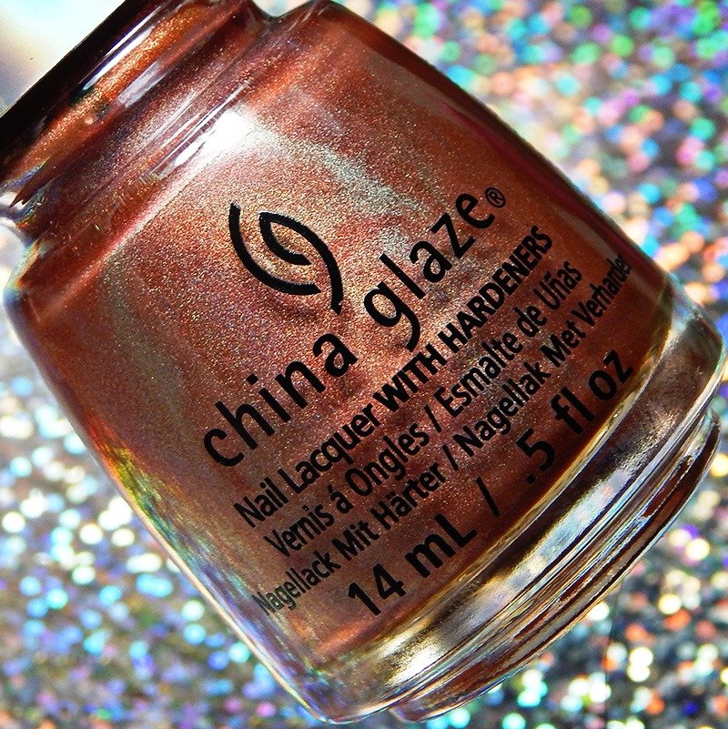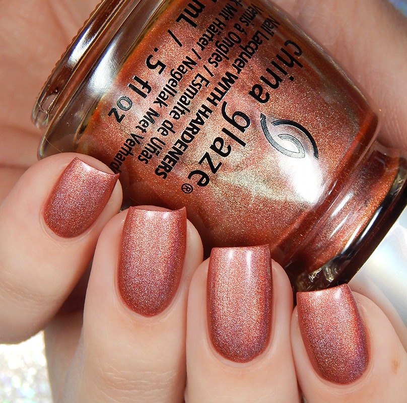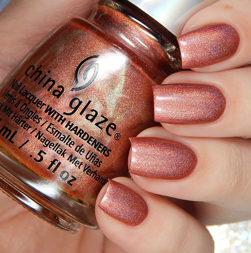 China Glaze TTYL is a warm copper linear holographic. I used 2 coats and a glossy top coat for these photos.