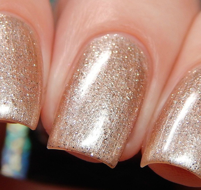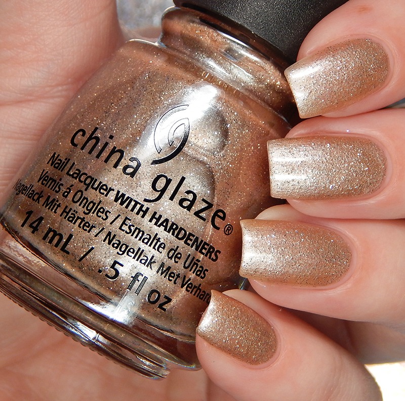 Girl On The Glow is a metallic taupeish bronze with silver microglitters mixed in. I used 2 coats and a glossy top coat for these photos.