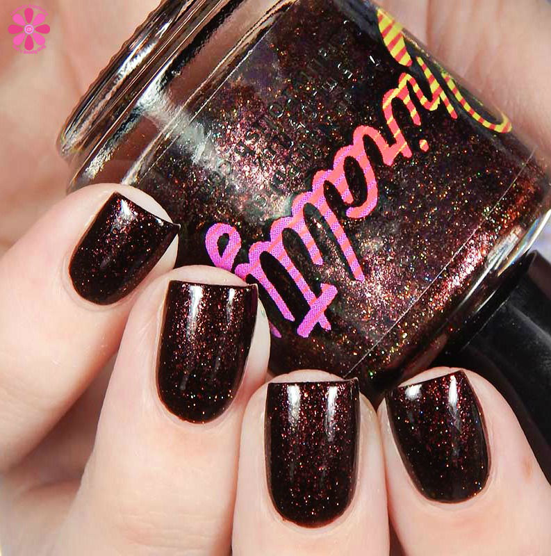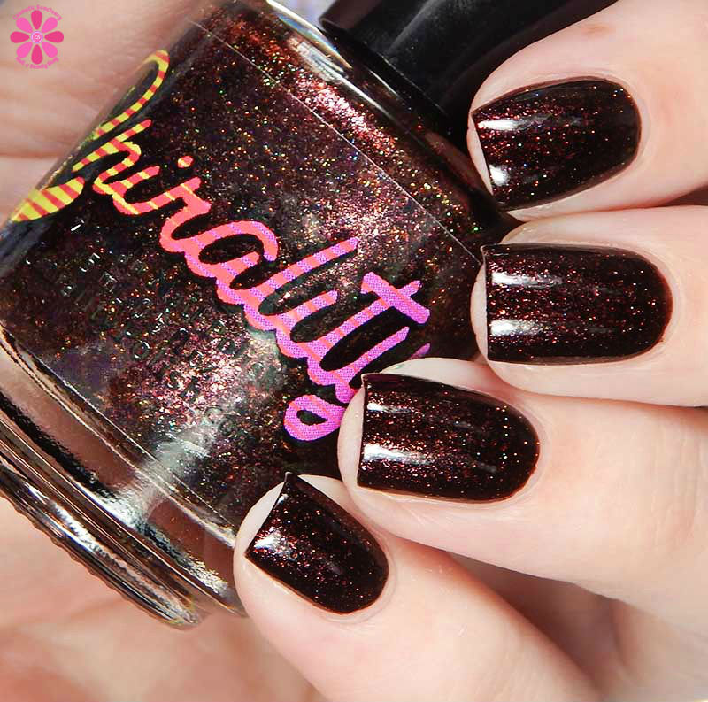 Chirality Nail Polish 1984 is a deep blackened red crelly base packed with red shimmer and holographic microglitter. I used 3 thin coats and a glossy top coat for these photos.