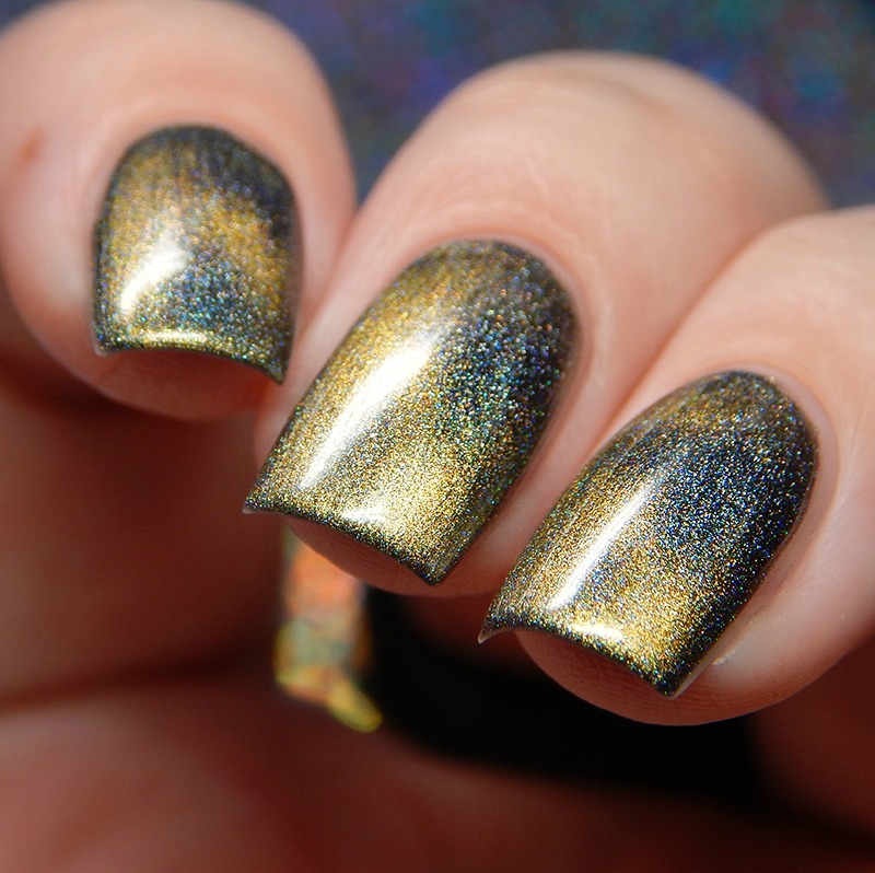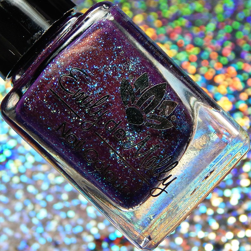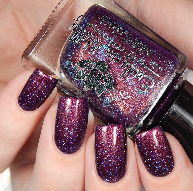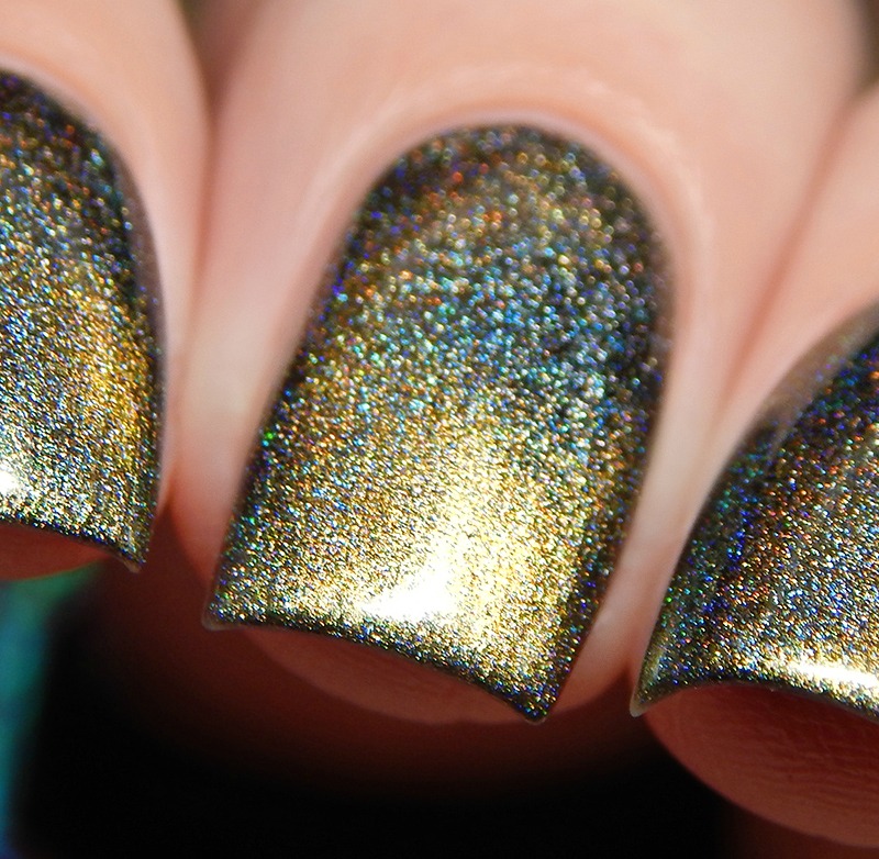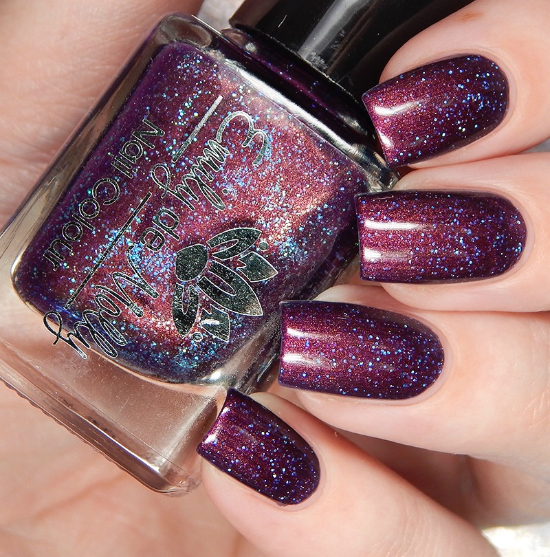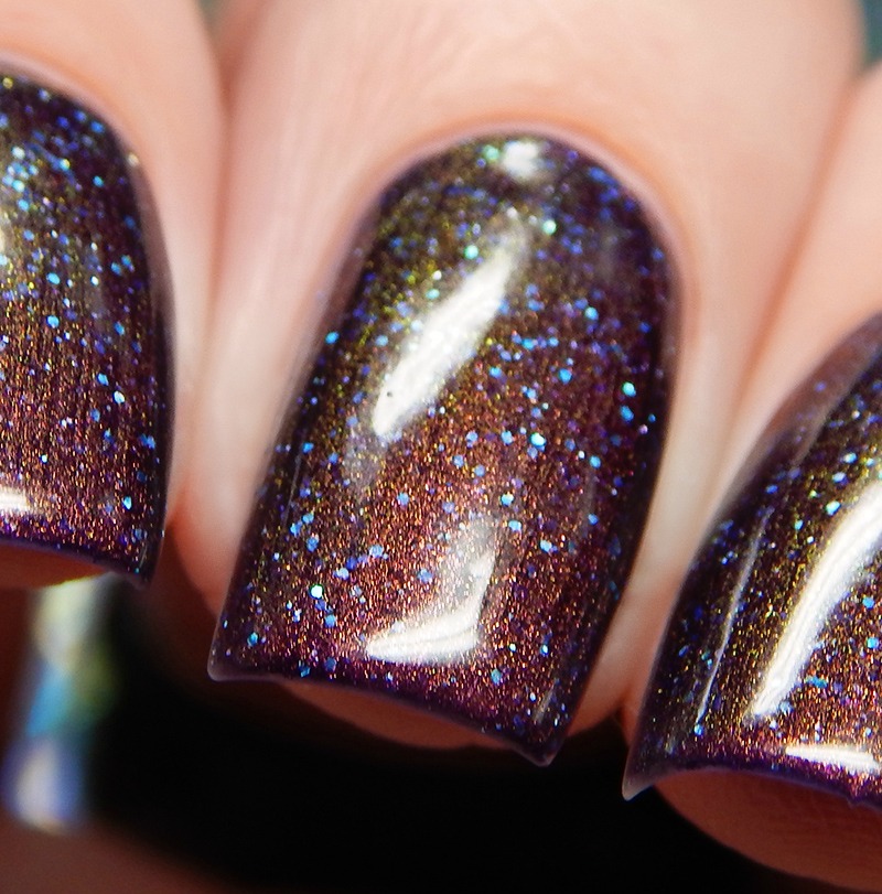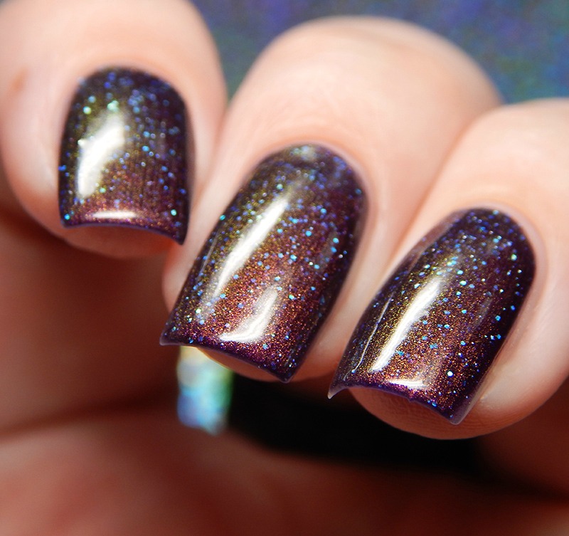 Spell It Backwards is a deep purple base loaded with pink to green multichrome shimmer and pale blue holographic microglitters. I used 2 coats and a glossy top coat for these photos.