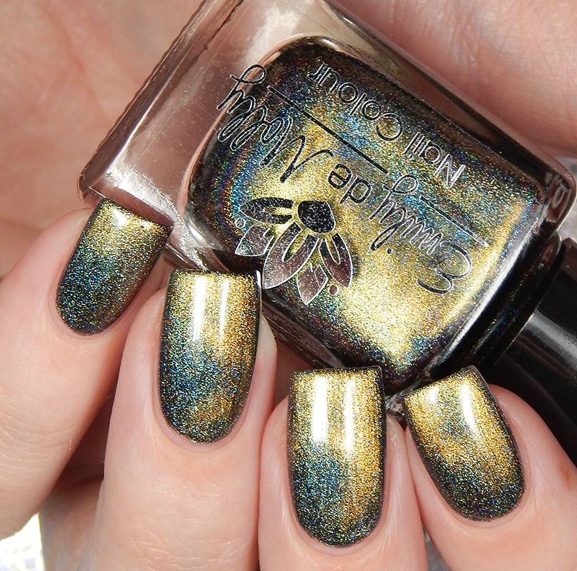 Clear Minded is a magnetic shade! Without using the magnet it looks like a rich, lush olive green with intense gold shimmer and a scattered holographic. When you use the magnet, it draws that gold shimmer out more and the base shifts to a blue green. I used the corner of the magnet so it’s a curvy design vs a straight line, but the magnetic shimmer is crazy good in this so you see a lot of it!