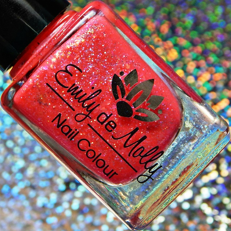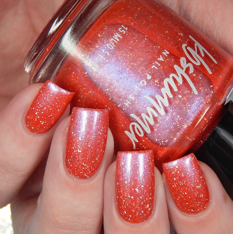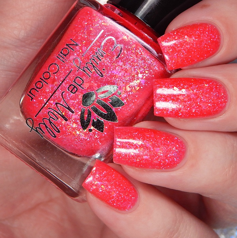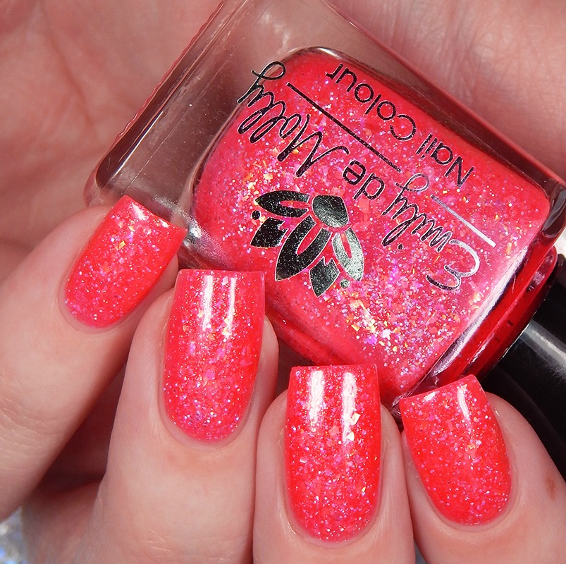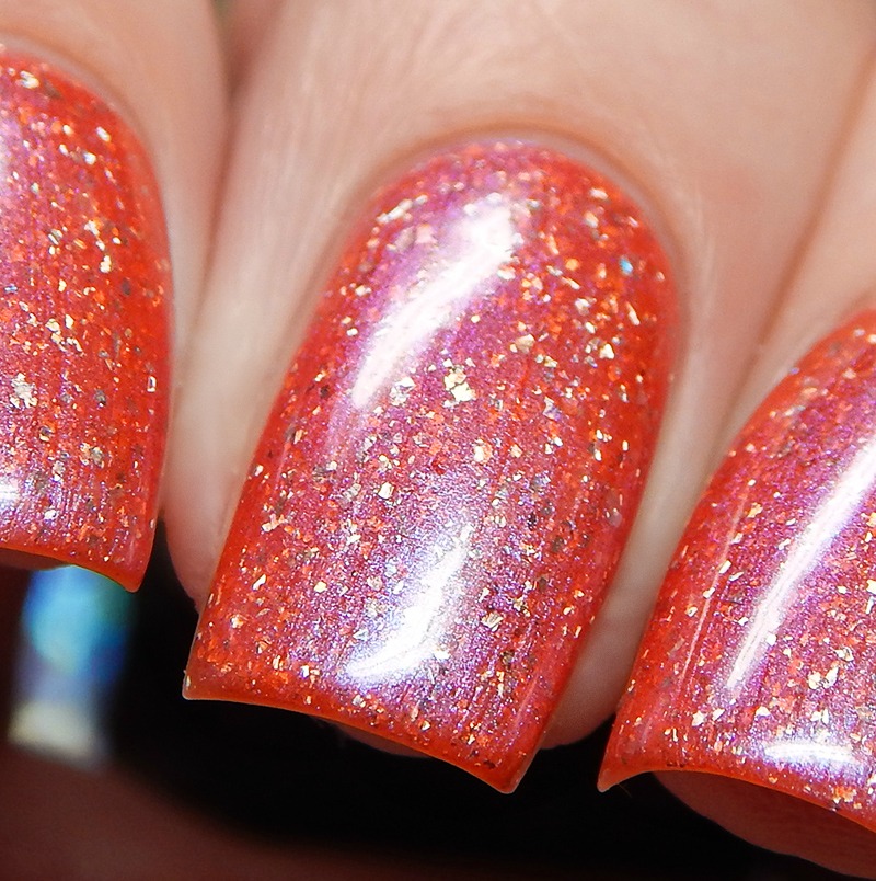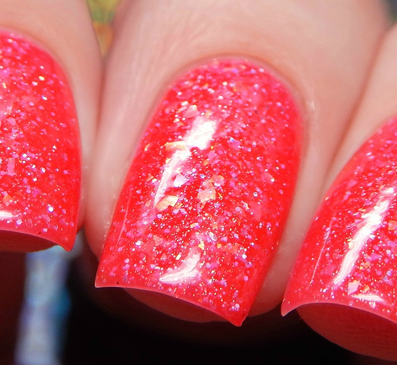 Out and About is a neon coral crelly base loaded with iridescent flakes and silver holographic microglitters. I used 3 thin coats and a glossy top coat for these photos.