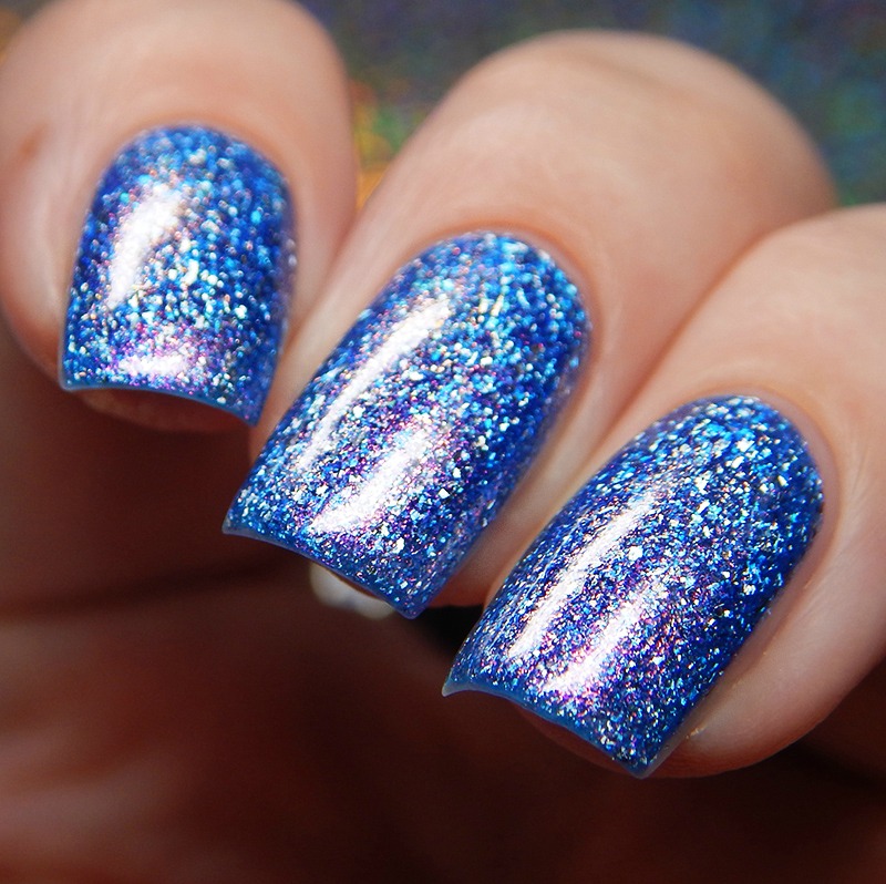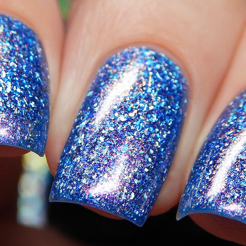 Seas The Day is a bright blue jelly base packed with pink to purple color shifting shimmer and a ton of silver holographic flecks. I used 3 thin coats and a glossy top coat for these photos. This polish has the slightest texture from the flakes, but seriously – it’s very slight. If you use a thin top coat you might need 2 coats, otherwise 1 should smooth it over just fine.