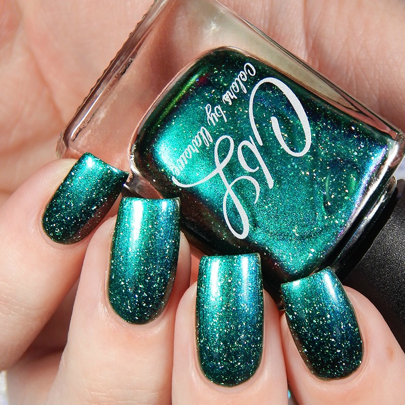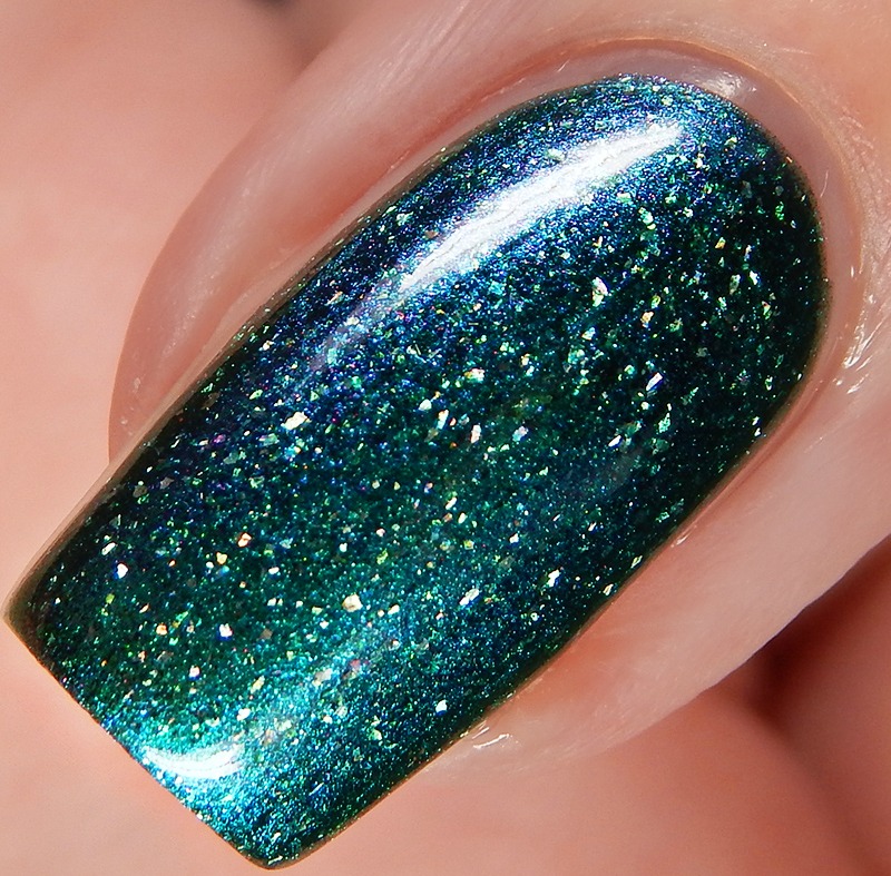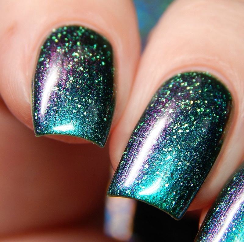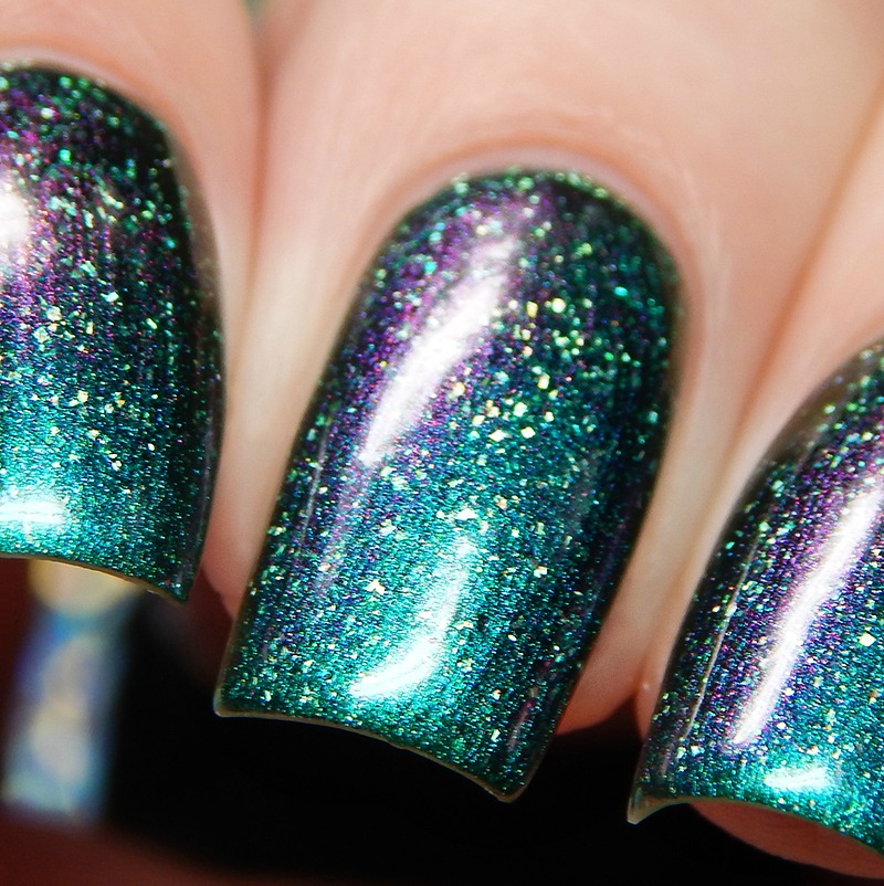 Colors by Llarowe Irish Eyes Are Smiling May 2018 POTM is an emerald green back that shifts blue to purple to gold and has prismatic holo flakes and aurora pigment that shifts from light green to purple. I used 2 coats and a glossy top coat for these photos.