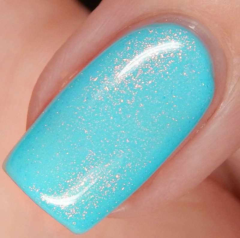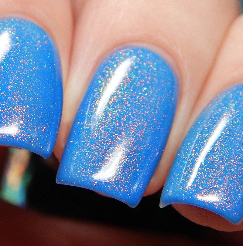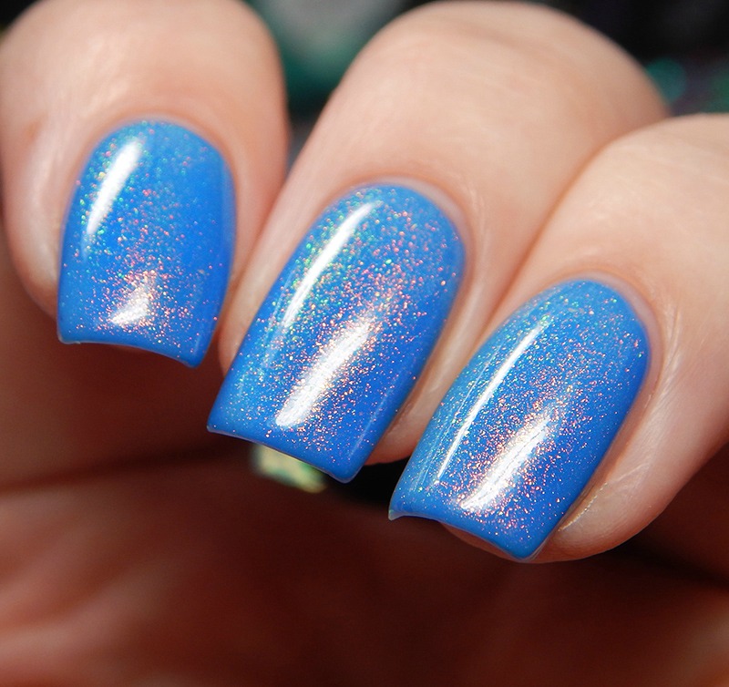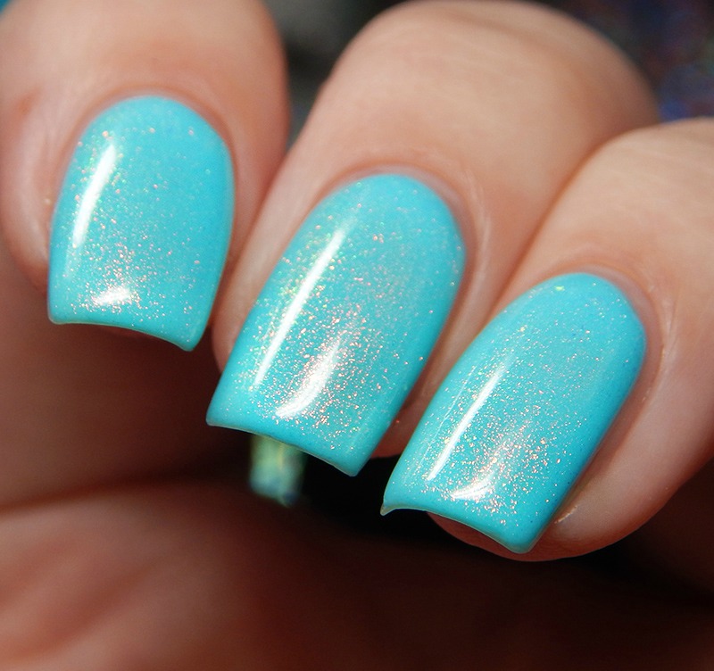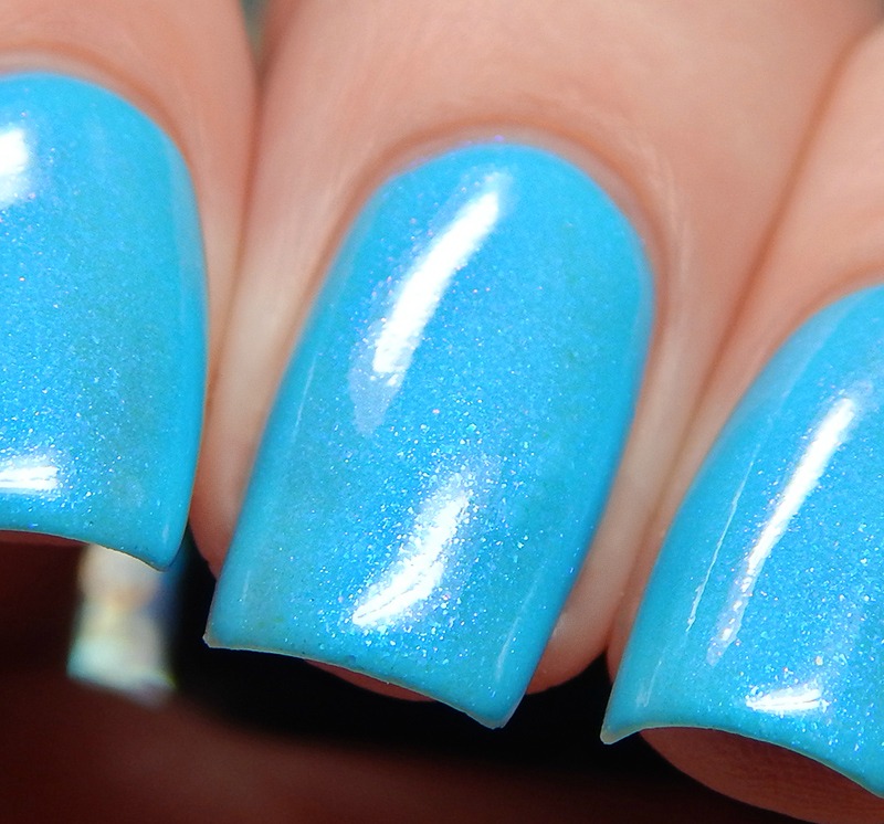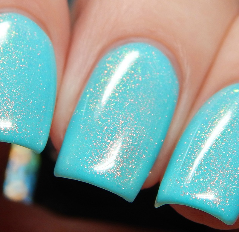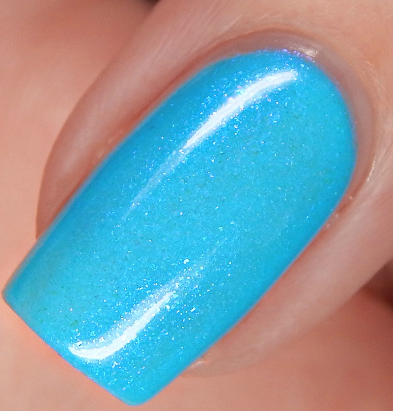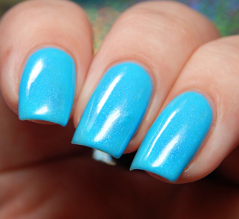 High Tide is an azure blue crelly base with aurora pigment mixed in that shifts bright aqua to pink to sky blue. I used 3 thin coats and a glossy top coat for these photos.