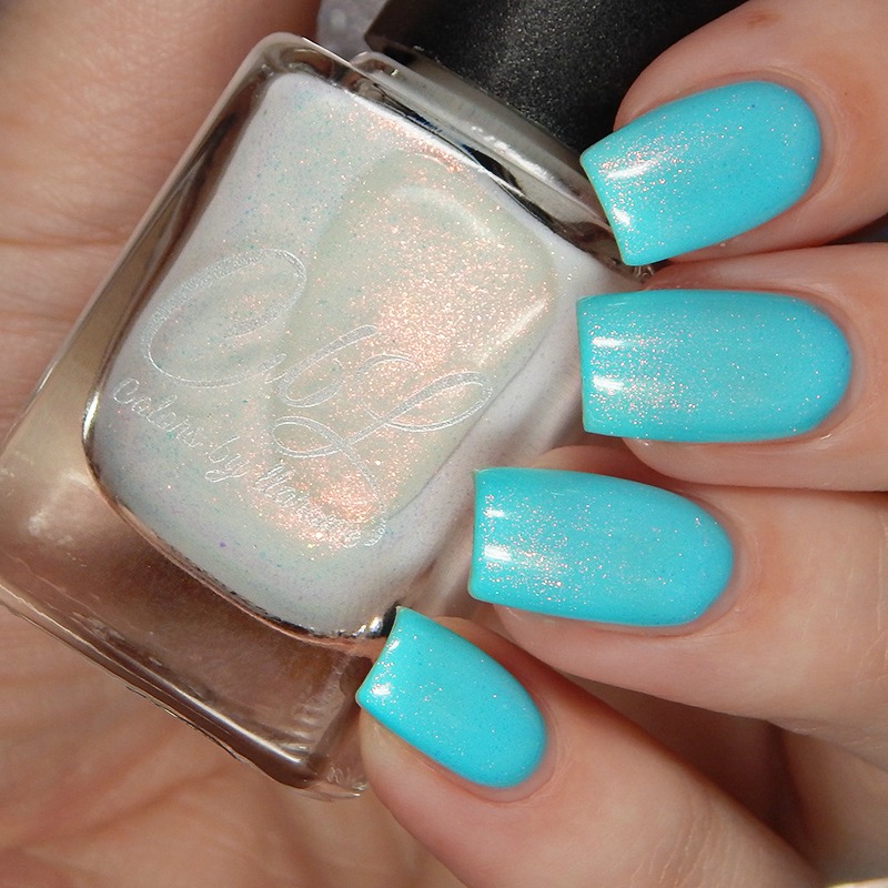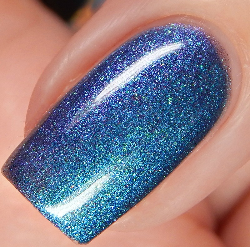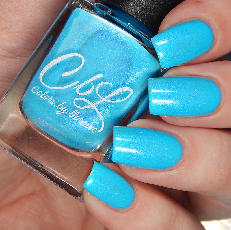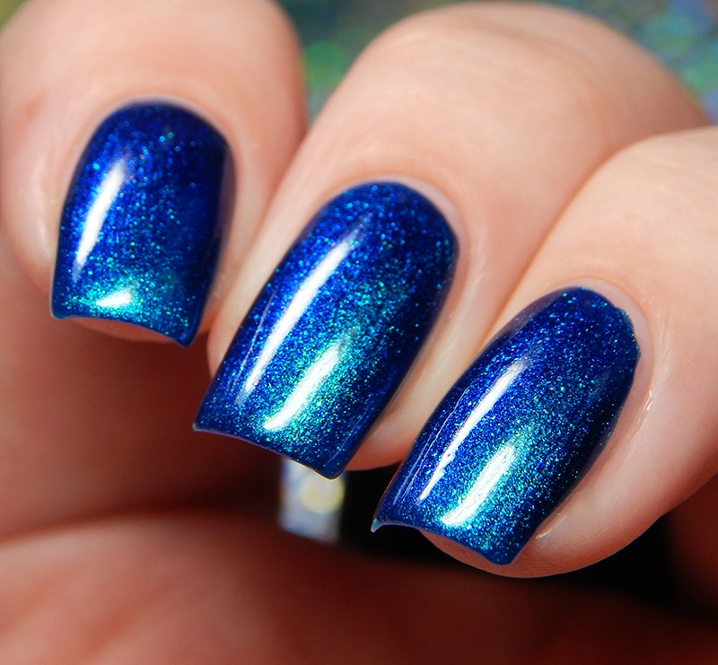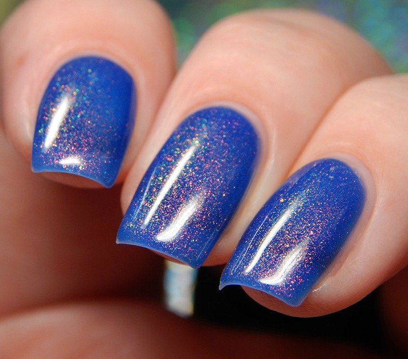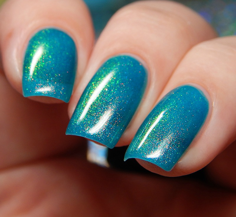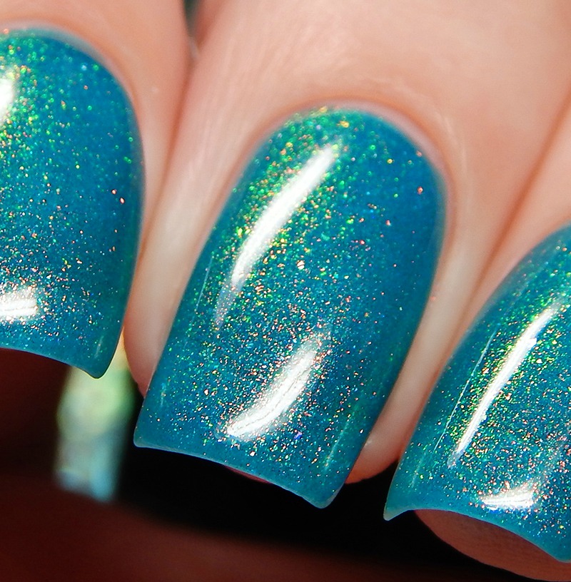 High Tide is an azure blue crelly base with aurora pigment mixed in that shifts bright aqua to pink to sky blue. I used 3 thin coats and a glossy top coat for these photos.
