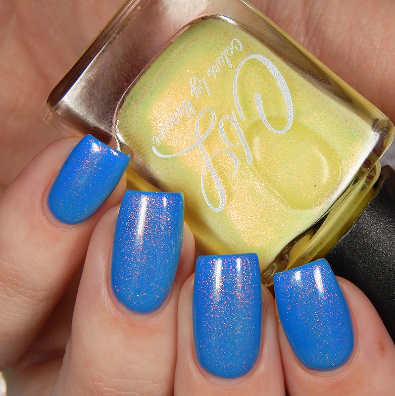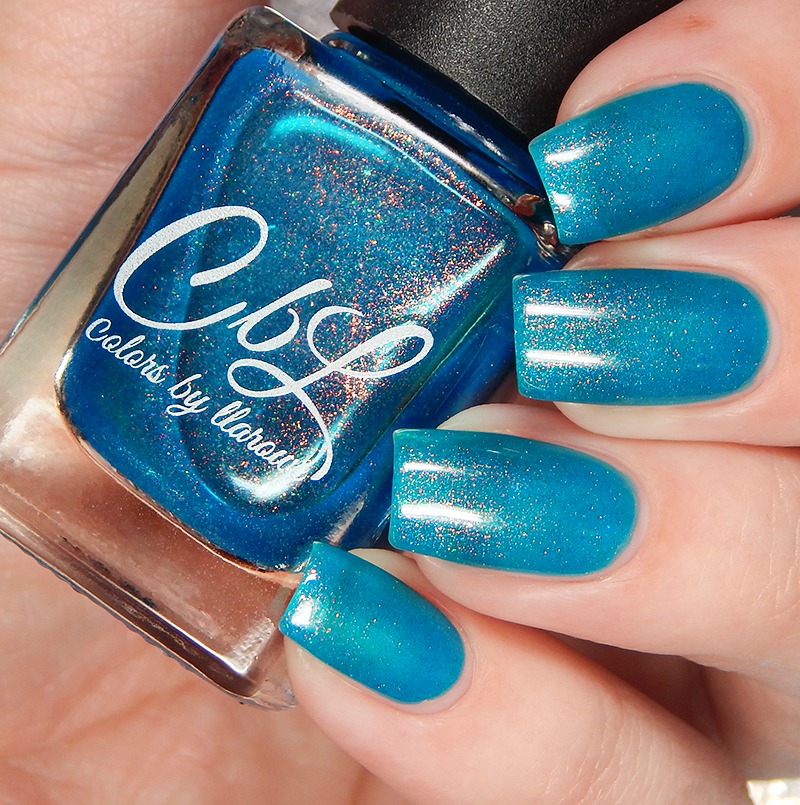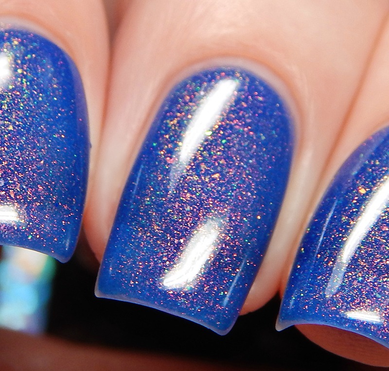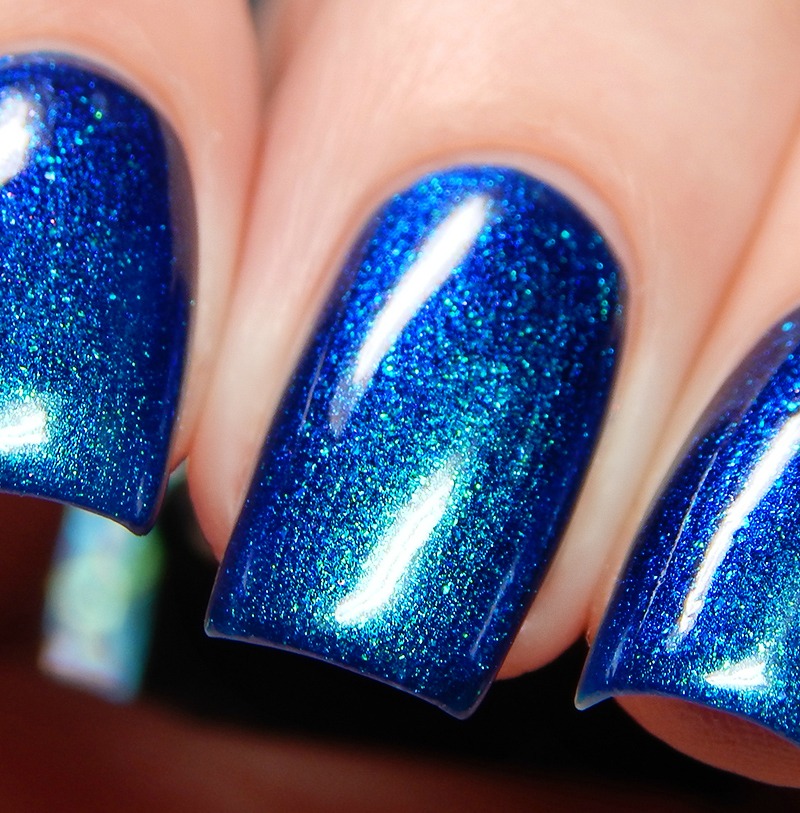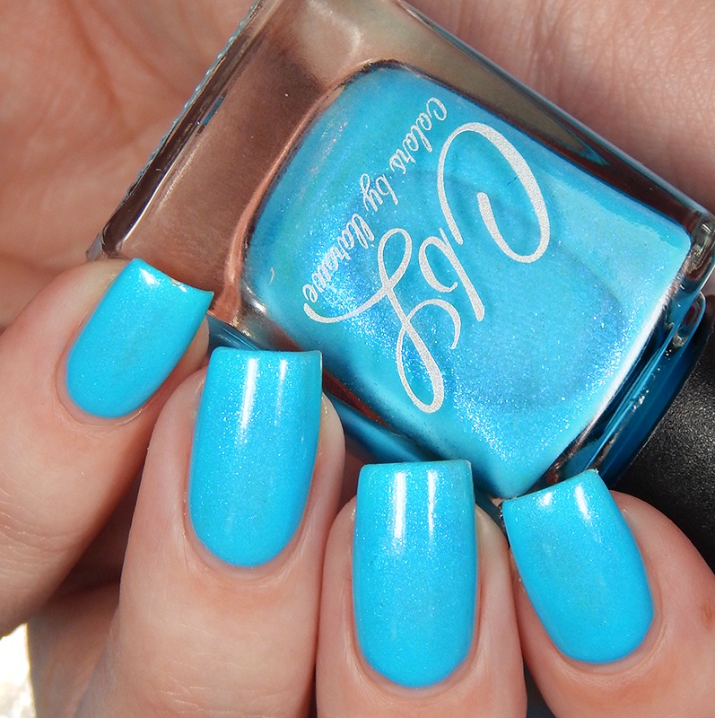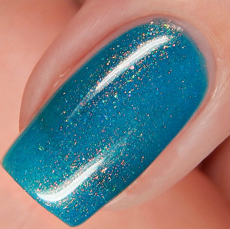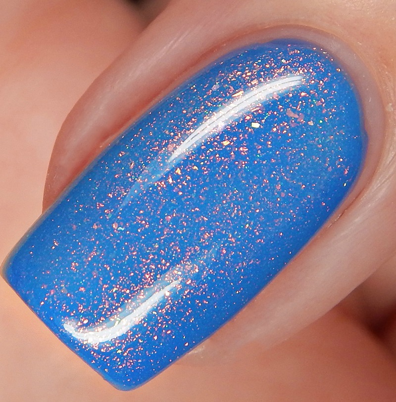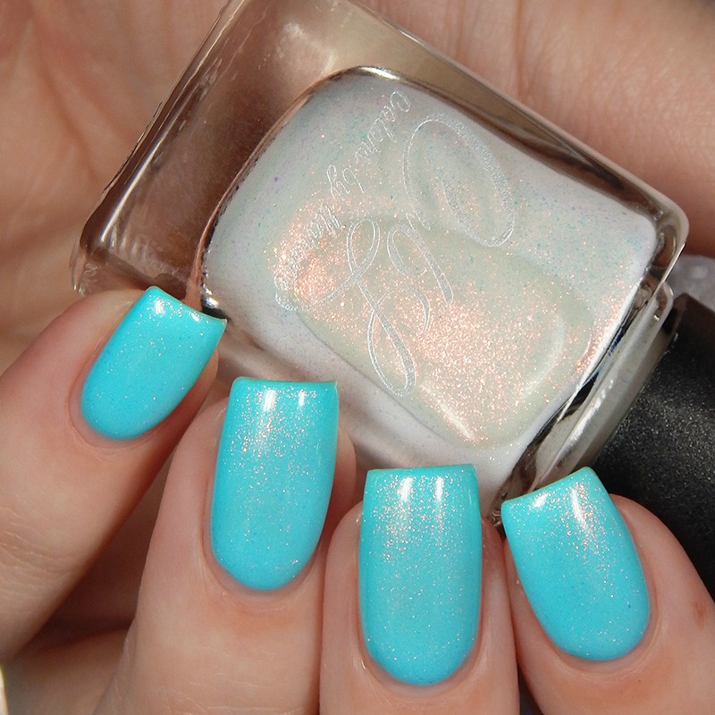 High Tide is an azure blue crelly base with aurora pigment mixed in that shifts bright aqua to pink to sky blue. I used 3 thin coats and a glossy top coat for these photos.