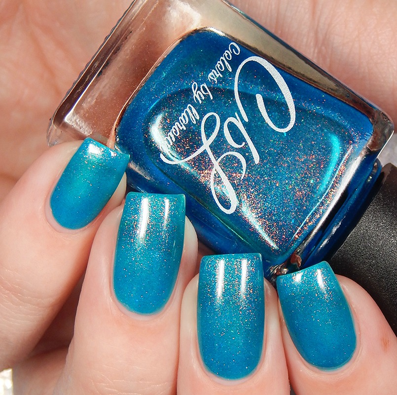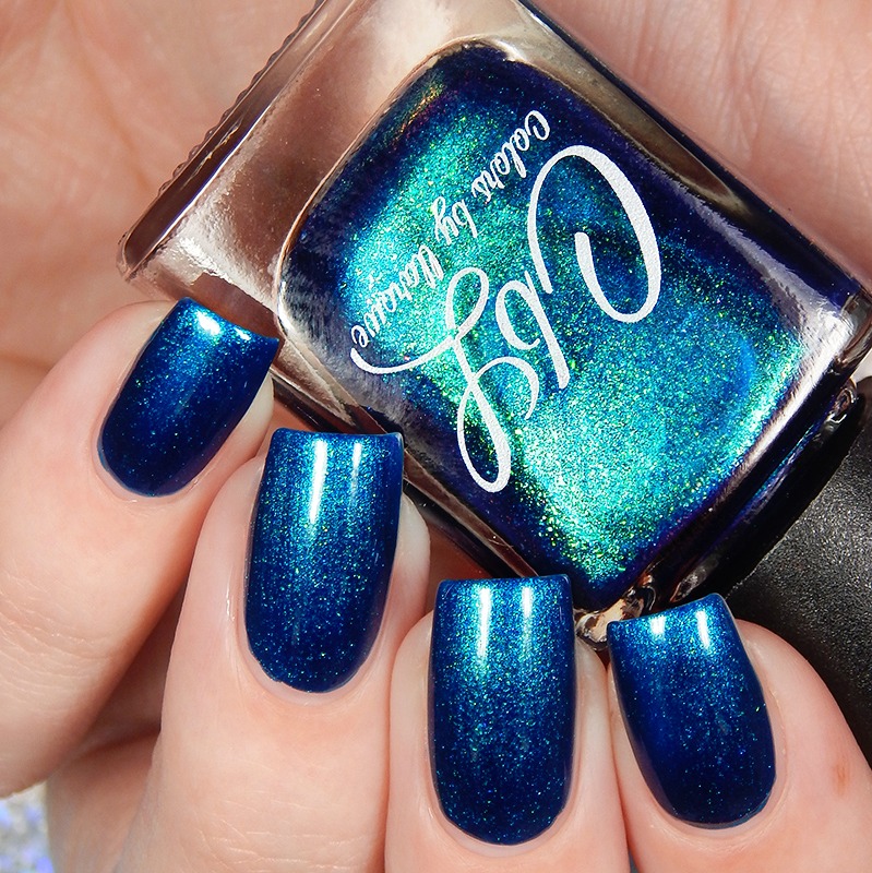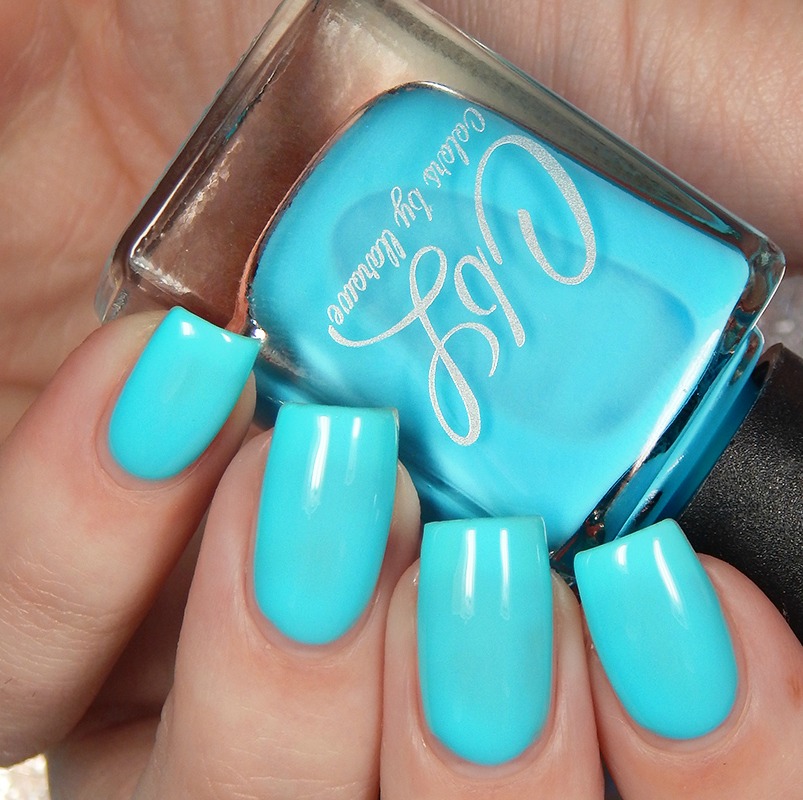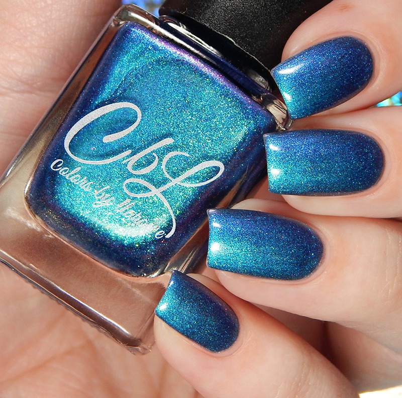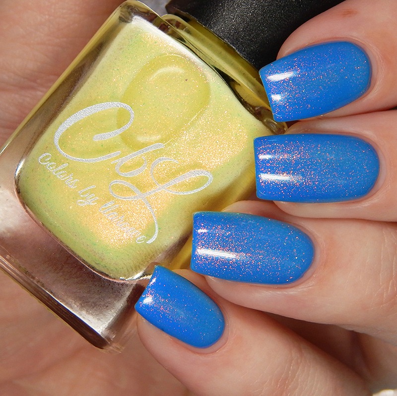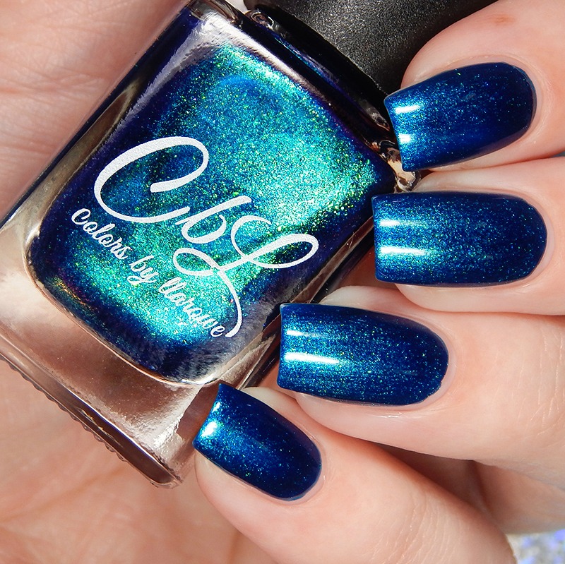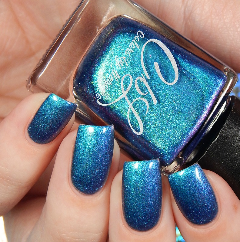 High Tide is an azure blue crelly base with aurora pigment mixed in that shifts bright aqua to pink to sky blue. I used 3 thin coats and a glossy top coat for these photos.