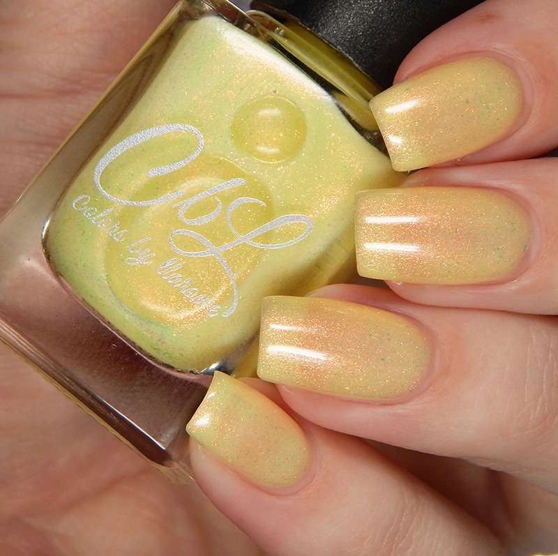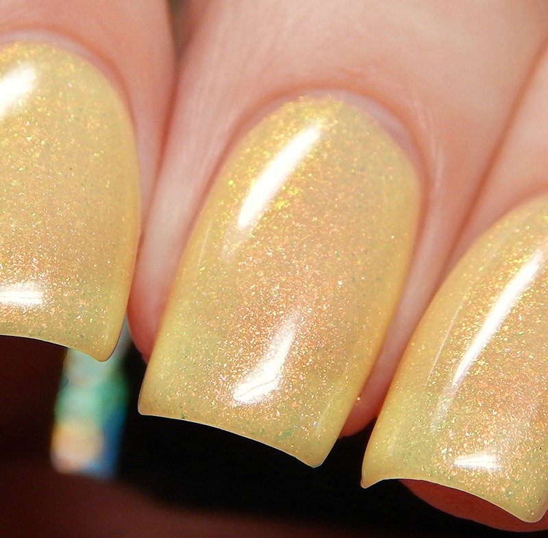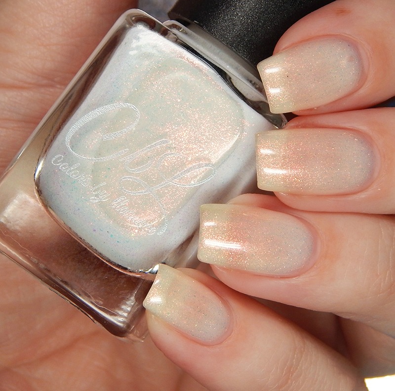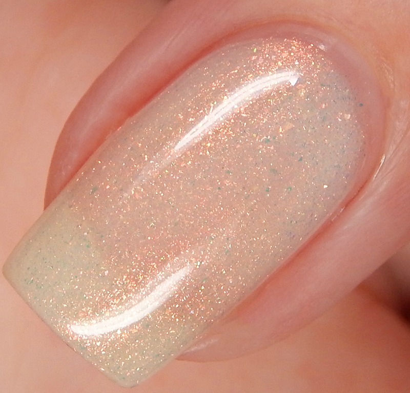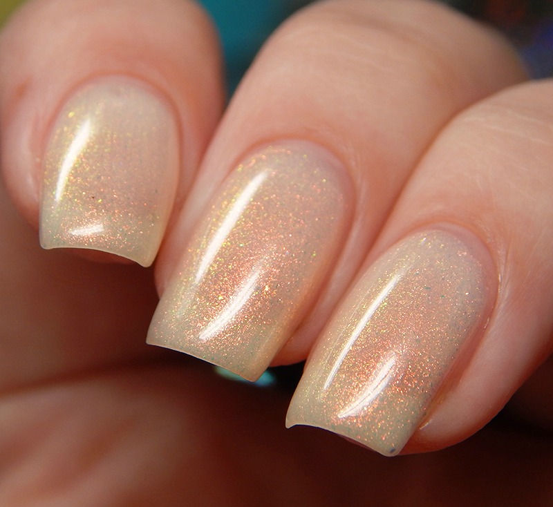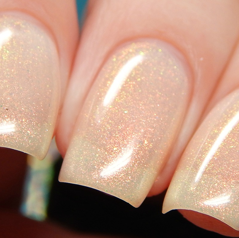 Building Sandcastles is a sheer white crelly base with unicorn pee and aurora pigment mixed in. I used 3 thin coats and a glossy top coat for these photos.