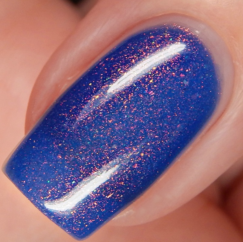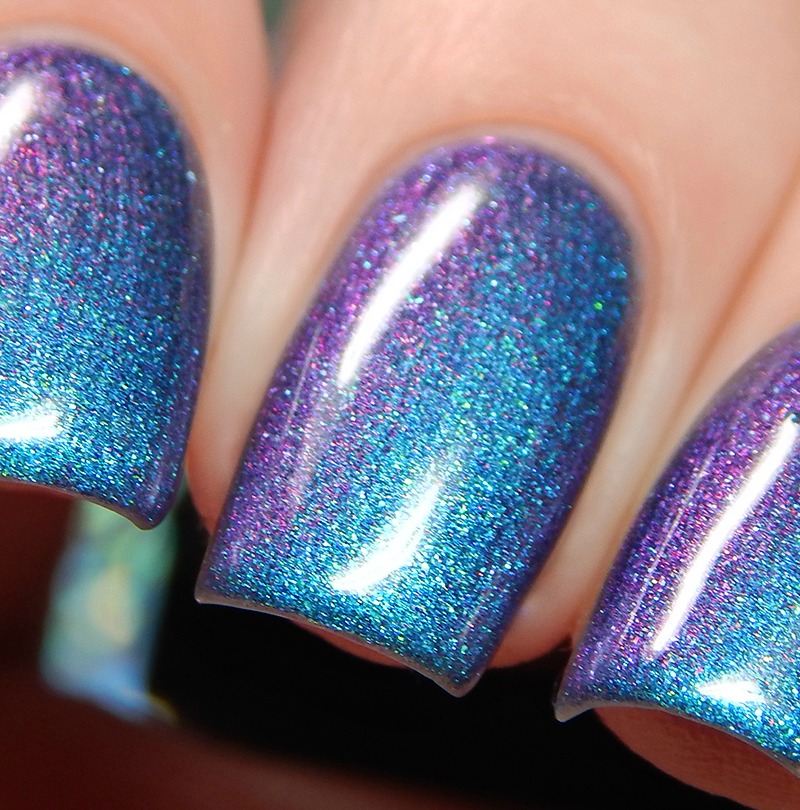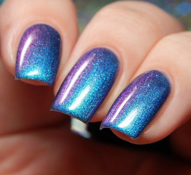 Hang Ten is a blurple jelly base with unicorn pee pigment and aurora pigment so you see lots of red to gold to green shifting shimmer. I used 3 thin coats and a glossy top coat for these photos.