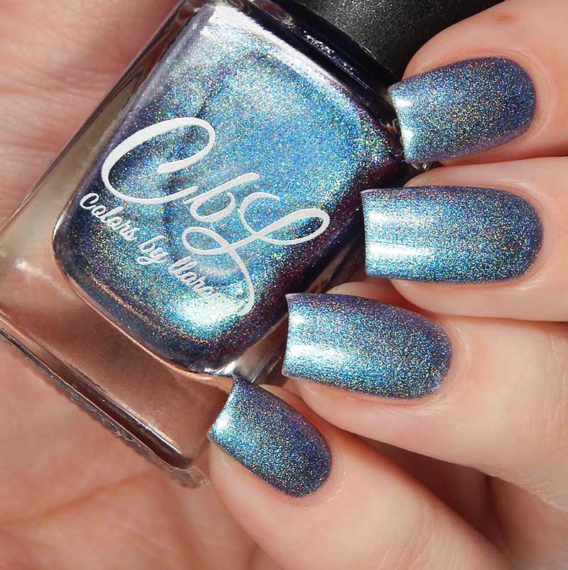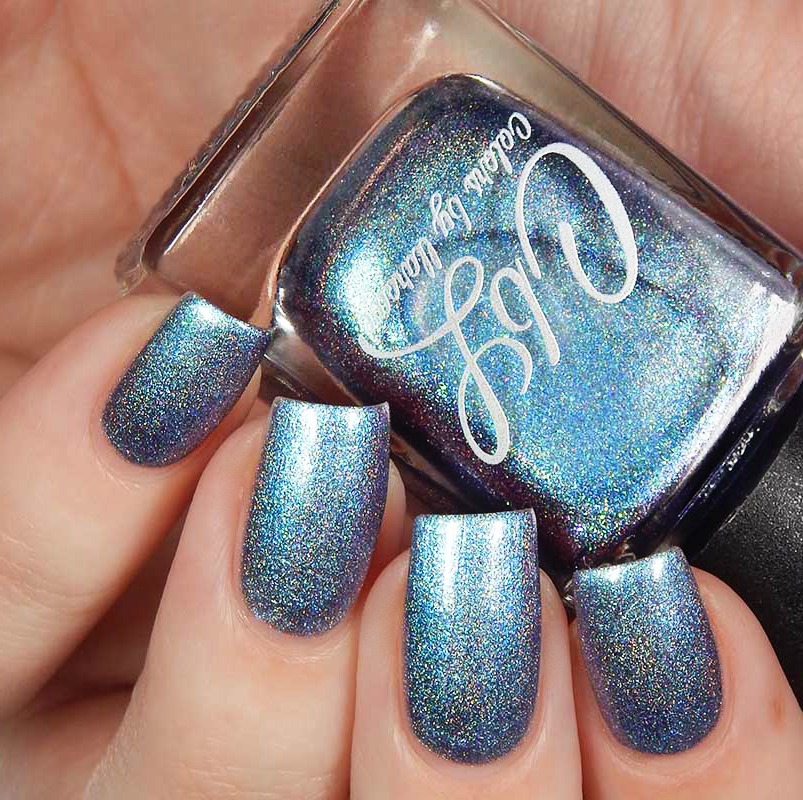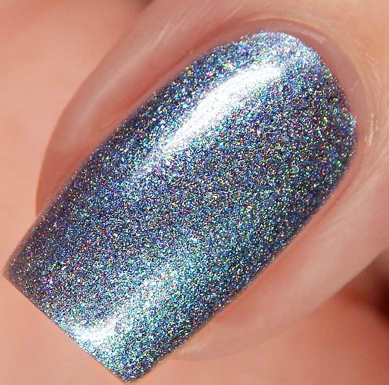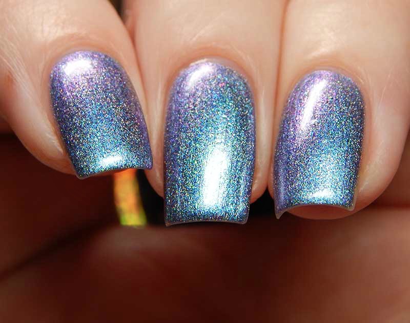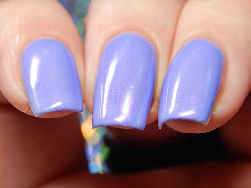 80 Degrees is a light aqua based linear holographic with lilac to pink to blue shifting shimmer mixed in. I used 3 thin coats and a glossy top coat for these photos.