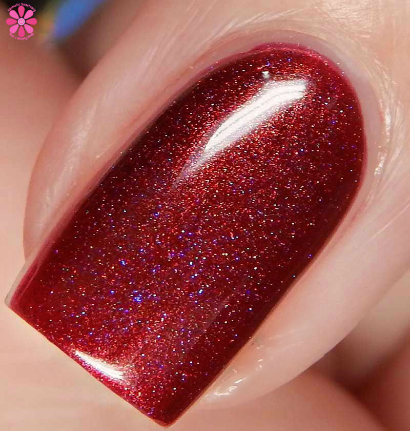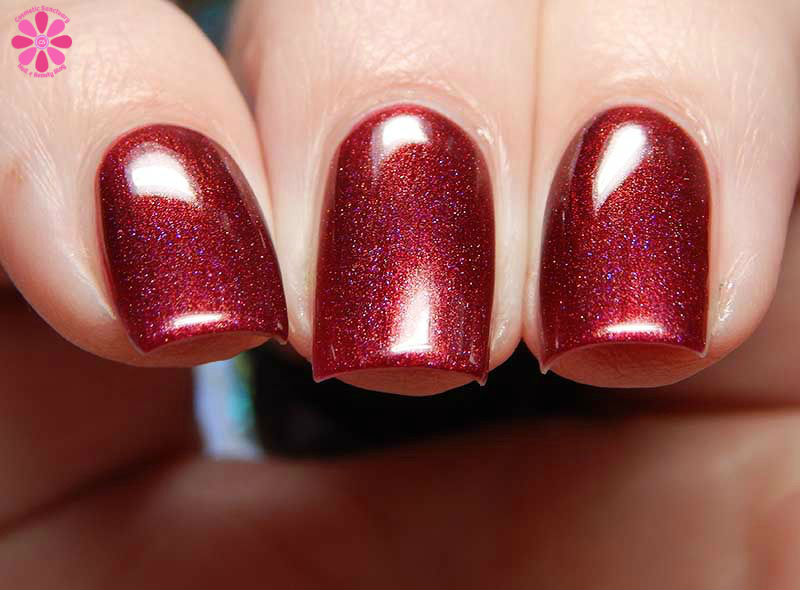 Amazon is a rich cool toned red with blackened gold shimmer and scattered holographic. The blackened gold shimmer really helps deepen the already gorgeous red. I used 2 coats and a glossy top coat for these photos.