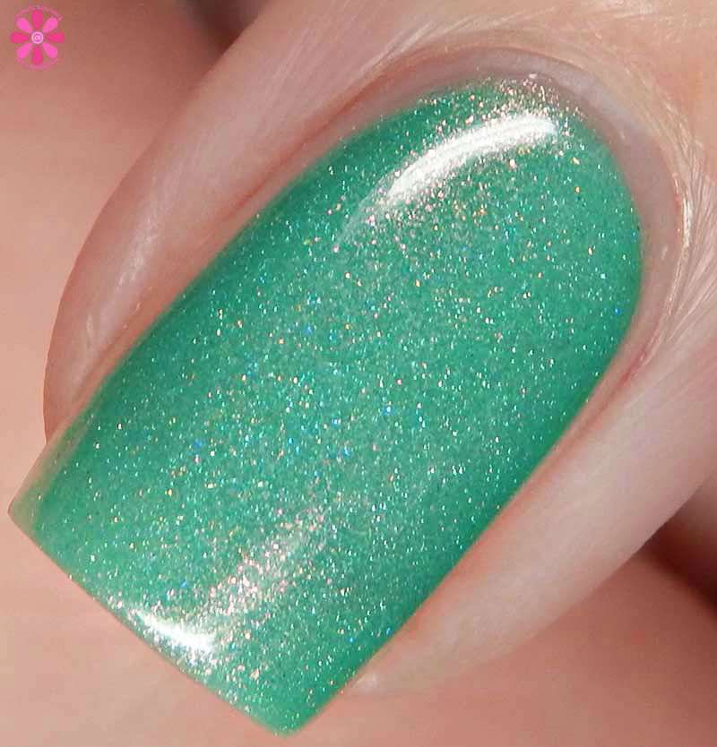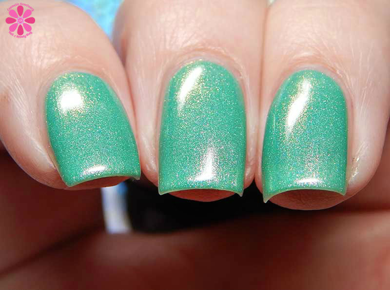 Rakashasa is a bright cool toned green with peach shimmer and scattered holographic. I used 2 coats and a glossy top coat for these photos.