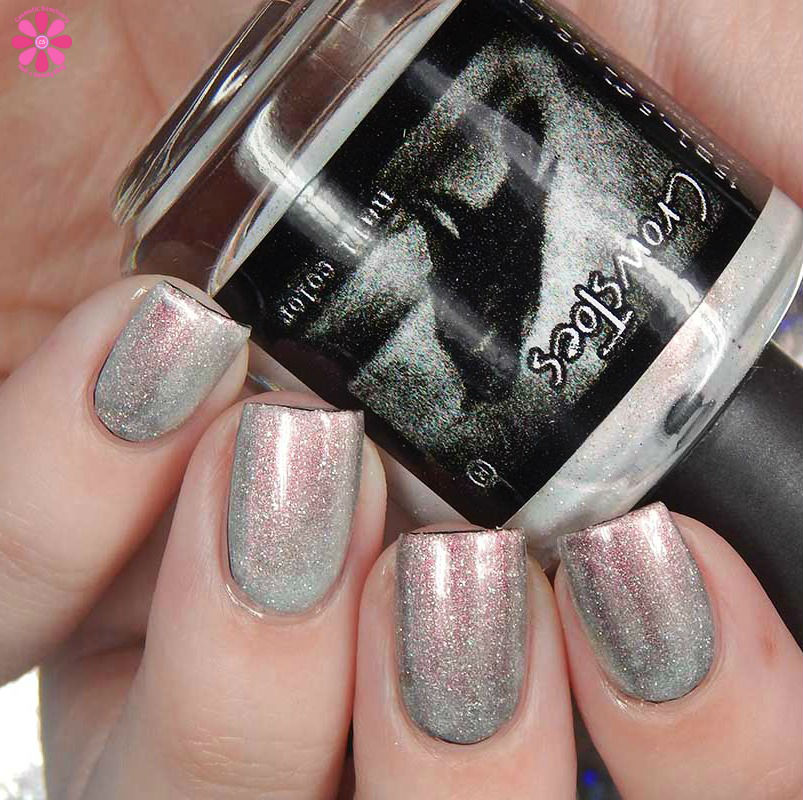 Projection, Deflection & Misdirection is another favorite. This is an off white pearly base with a teal to violet shift and holo microglitters mixed in. The shift is obvious but still slightly toned down. I used 1 coat over a black creme for these photos.
